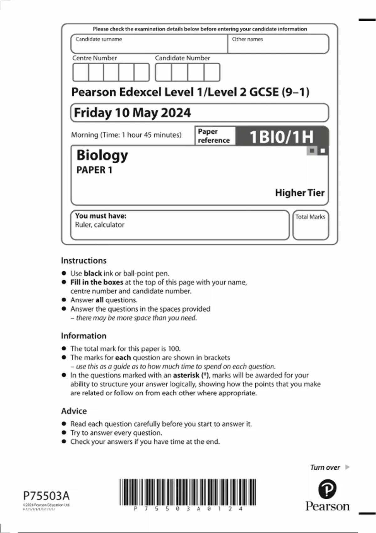 2024 Pearson Edexcel GCSE Biology Paper 1 (1BIO/1H)