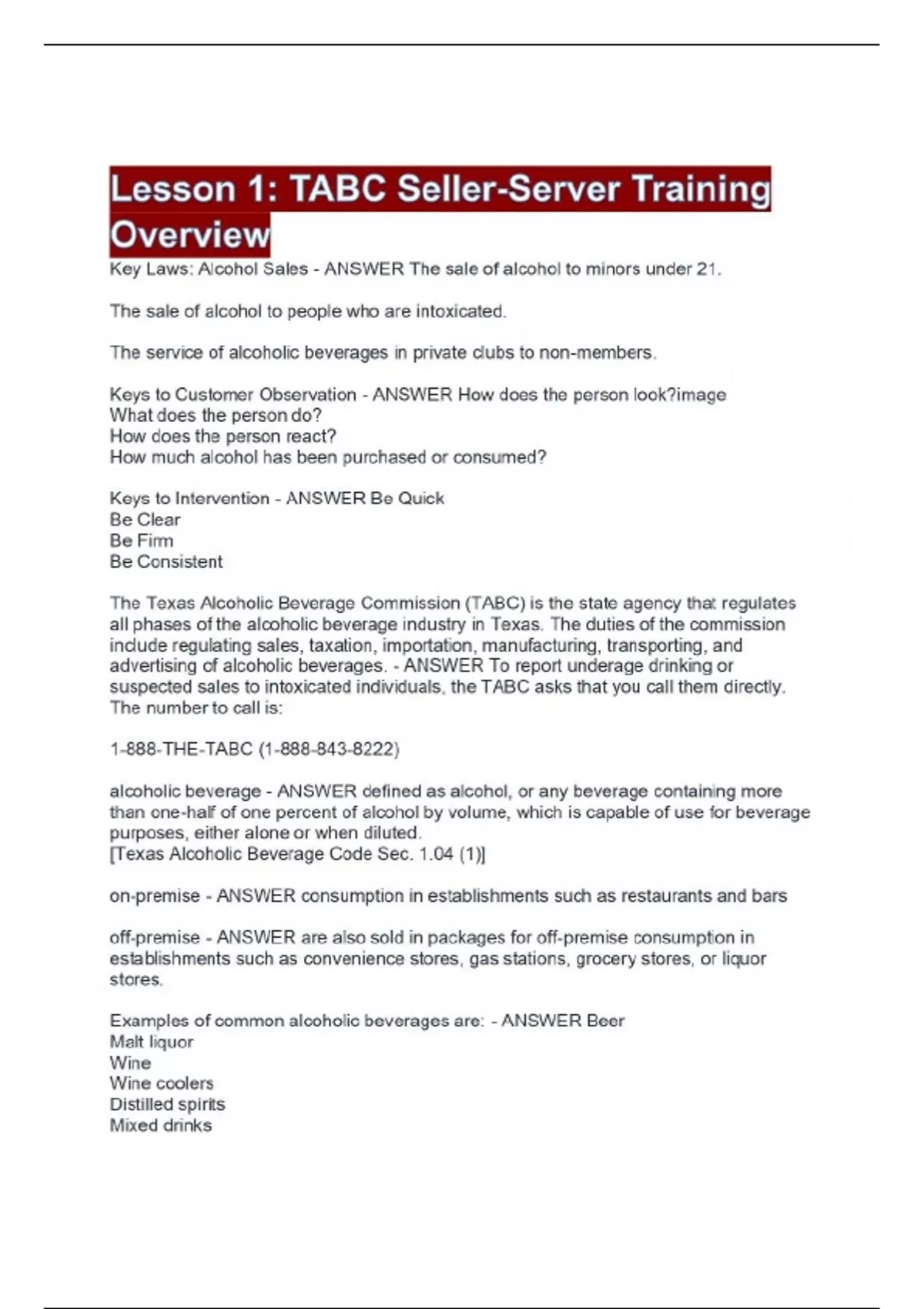 Key Laws: Alcohol Sales - ANSWER The sale of alcohol to minors under 21. The sale of alcohol to people who are intoxicated. The service of alcoholic beverages in private clubs to non-members. Keys to Customer Observation - ANSWER How does the person look?image What does the person do? How does the person react? How much alcohol has been purchased or consumed? Keys to Intervention - ANSWER Be Quick Be Clear Be Firm Be Consistent The Texas Alcoholic Beverage Commission (TABC) is the state agency that regulates all phases of the alcoholic beverage industry in Texas. The duties of the commission include regulating sales, taxation, importation, manufacturing, transporting, and advertising of alcoholic beverages. - ANSWER To report underage drinking or suspected sales to intoxicated individuals, the TABC asks that you call them directly. The number to call is: 1-888-THE-TABC () alcoholic beverage - ANSWER defined as alcohol, or any beverage containing more than one-half of one percent of alcohol by volume, which is capable of use for beverage purposes, either alone or when diluted. [Texas Alcoholic Beverage Code Sec. 1.04 (1)] on-premise - ANSWER consumption in establishments such as restaurants and bars off-premise - ANSWER are also sold in packages for off-premise consumption in establishments such as convenience stores, gas stations, grocery stores, or liquor stores. Examples of common alcoholic beverages are: - ANSWER Beer Malt liquor Wine Wine coolers Distilled spirits Mixed drinks