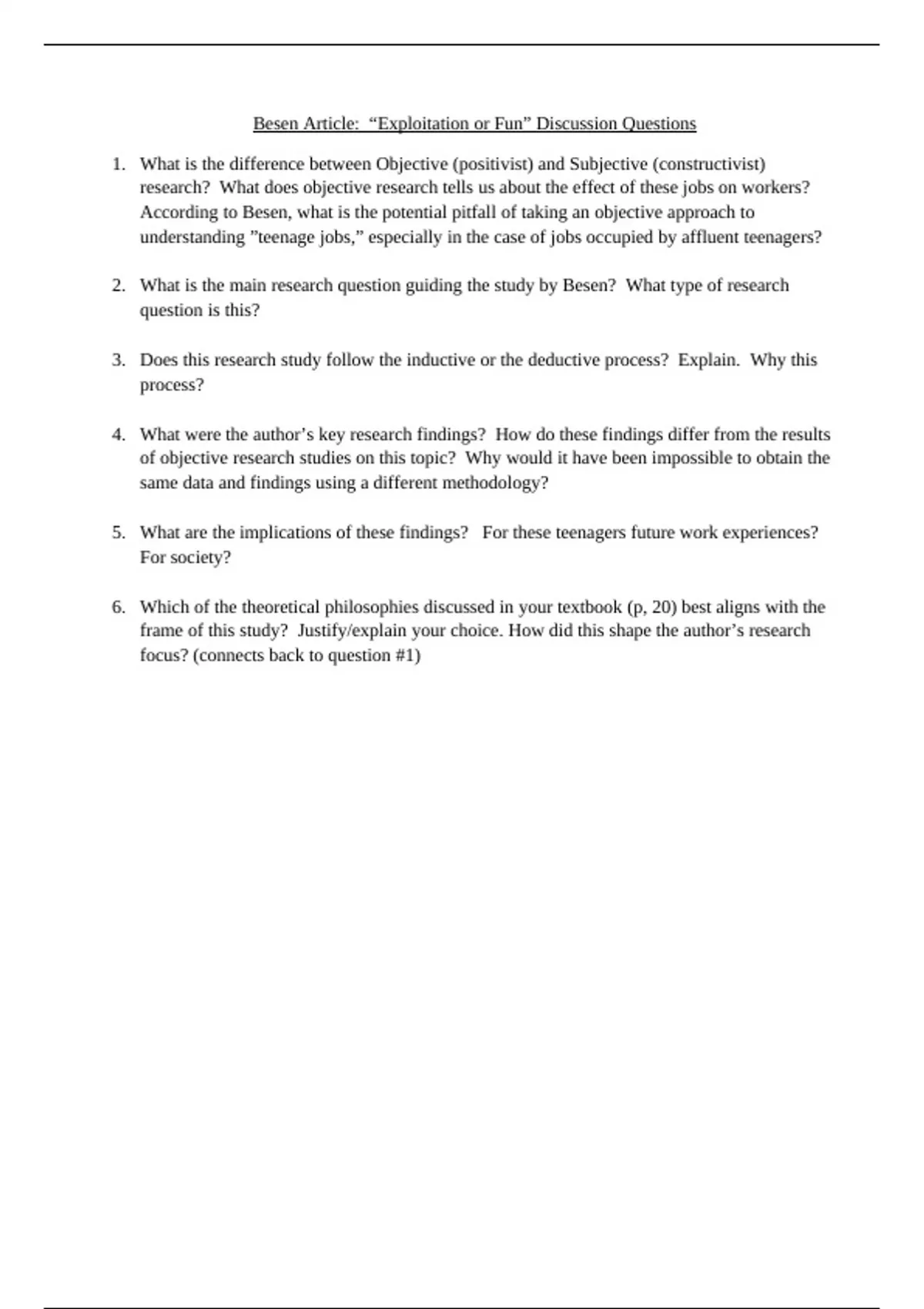 Besen Article: “Exploitation or Fun” Discussion Questions