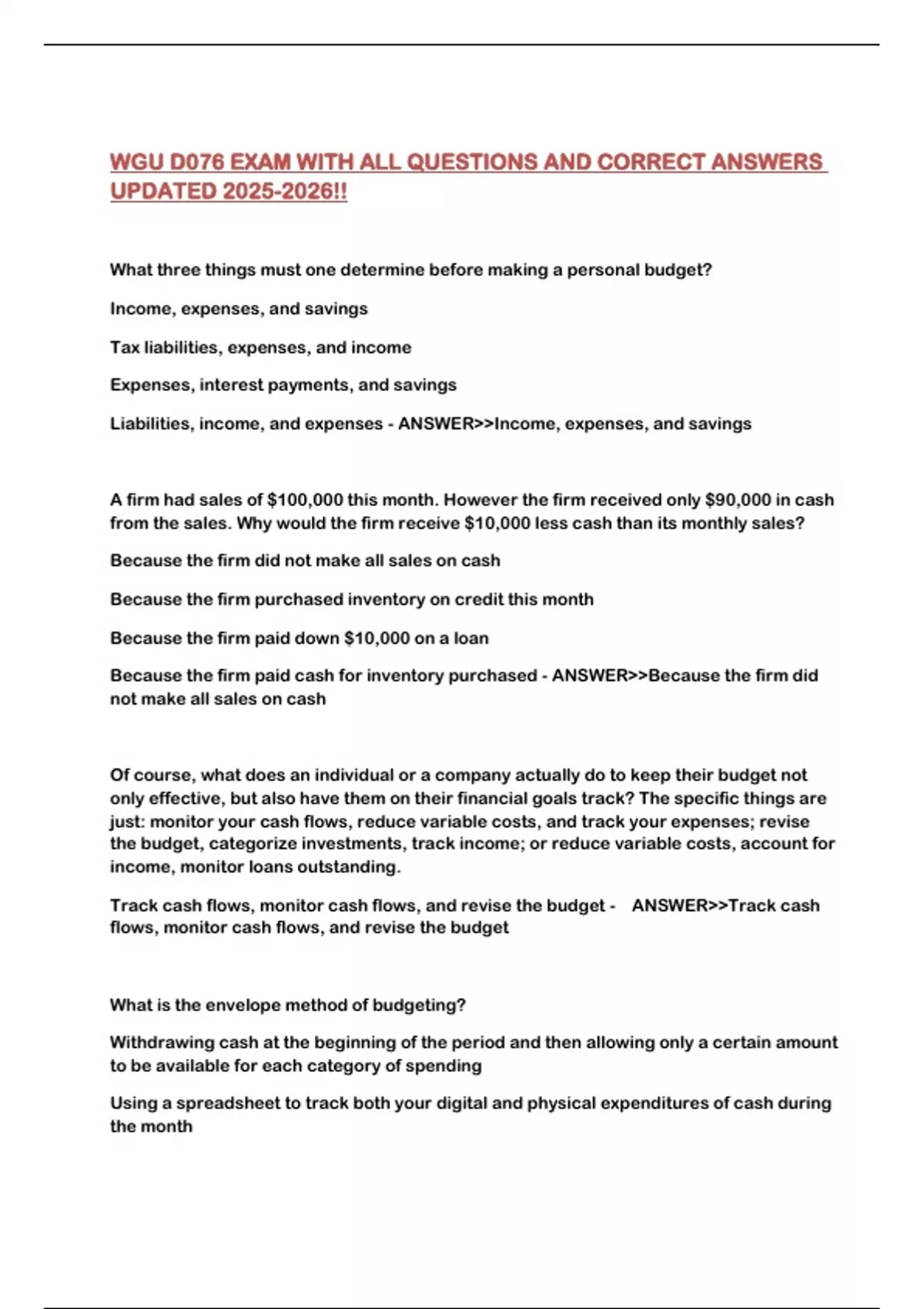Track cash flows, monitor cash flows, and revise the budget - ANSWER>>Track cash