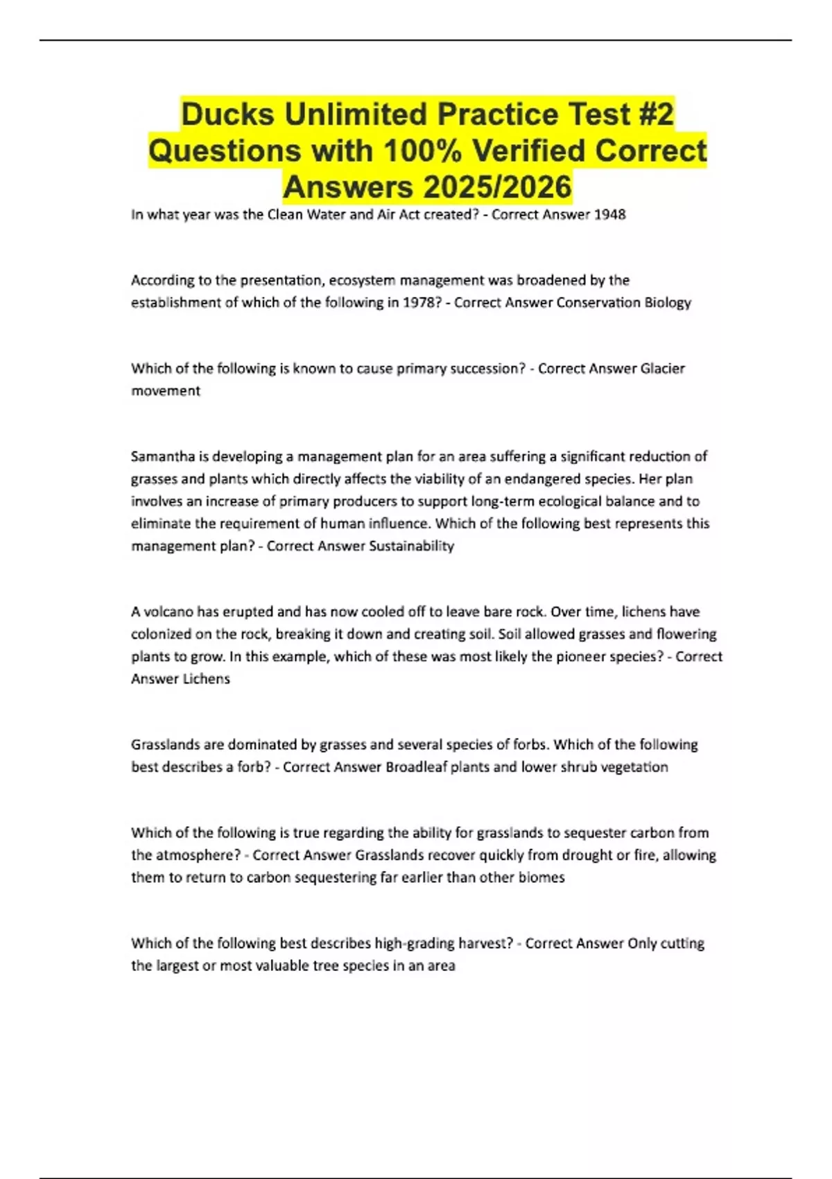 Ducks Unlimited Practice Test #2 Questions with 100% Verified Correct Answers 2025/2026 In what year was the Clean Water and Air Act created? - Correct Answer 1948 According to the presentation, ecosystem management was broadened by the establishment of which of the following in 1978? - Correct Answer Conservation Biology Which of the following is known to cause primary succession? - Correct Answer Glacier movement Samantha is developing a management plan for an area suffering a significant reduction of grasses and plants which directly affects the viability of an endangered species. Her plan involves an increase of primary producers to support long-term ecological balance and to eliminate the requirement of human influence. Which of the following best represents this management plan? - Correct Answer Sustainability A volcano has erupted and has now cooled off to leave bare rock. Over time, lichens have colonized on the rock, breaking it down and creating soil. Soil allowed grasses and flowering plants to grow. In this example, which of these was most likely the pioneer species? - Correct Answer Lichens Grasslands are dominated by grasses and several species of forbs. Which of the following best describes a forb? - Correct Answer Broadleaf plants and lower shrub vegetation Which of the following is true regarding the ability for grasslands to sequester carbon from the atmosphere? - Correct Answer Grasslands recover quickly from drought or fire, allowing them to return to carbon sequestering far earlier than other biomes Which of the following best describes high-grading harvest? - Correct Answer Only cutting the largest or most valuable tree species in an area
