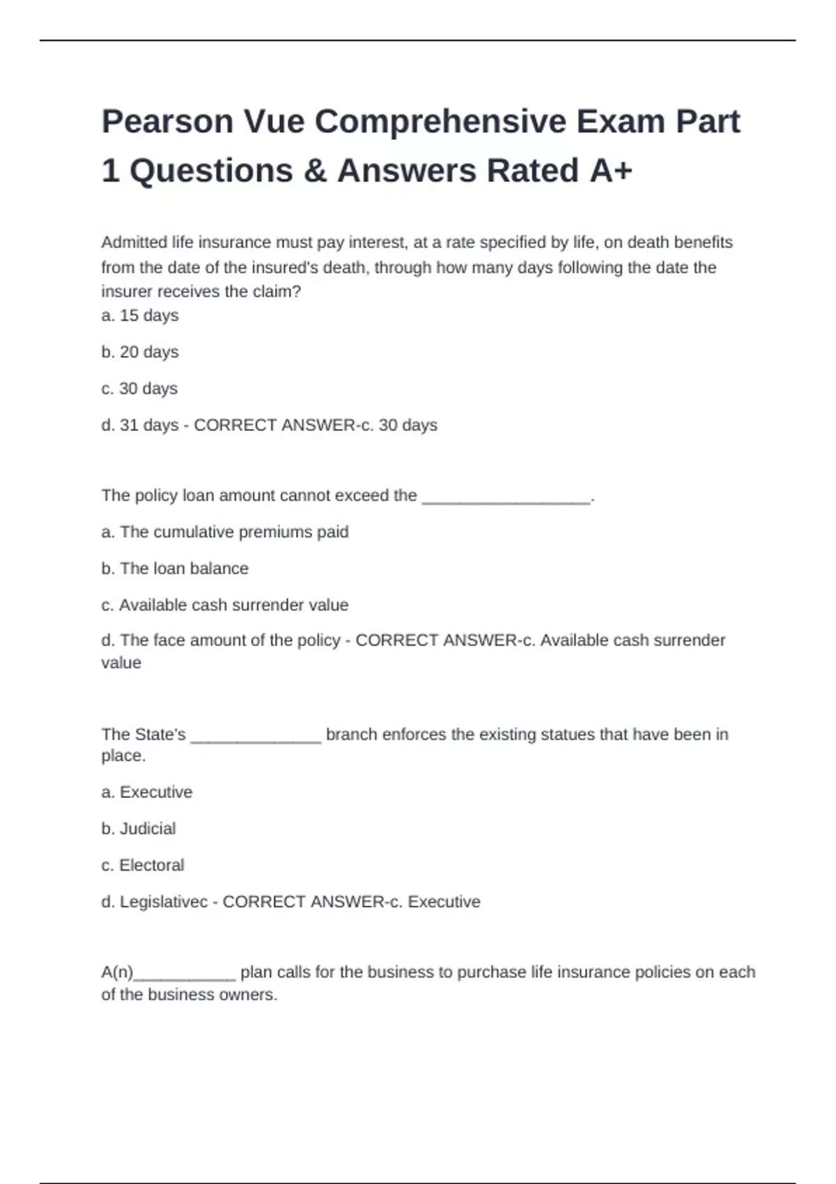 Admitted life insurance must pay interest, at a rate specified by life, on death benefits from the date of the insured's death, through how many days following the date the insurer receives the claim? a. 15 days b. 20 days c. 30 days d. 31 days - CORRECT ANSWER-c. 30 days The policy loan amount cannot exceed the __________________. a. The cumulative premiums paid b. The loan balance c. Available cash surrender value d. The face amount of the policy - CORRECT ANSWER-c. Available cash surrender value The State's ______________ branch enforces the existing statues that have been in place. a. Executive b. Judicial c. Electoral d. Legislativec - CORRECT ANSWER-c. Executive A(n)___________ plan calls for the business to purchase life insurance policies on each of the business owners. a. Cross Purchase b. Entity c. Group d. Credit Protection - CORRECT ANSWER-b. Entity