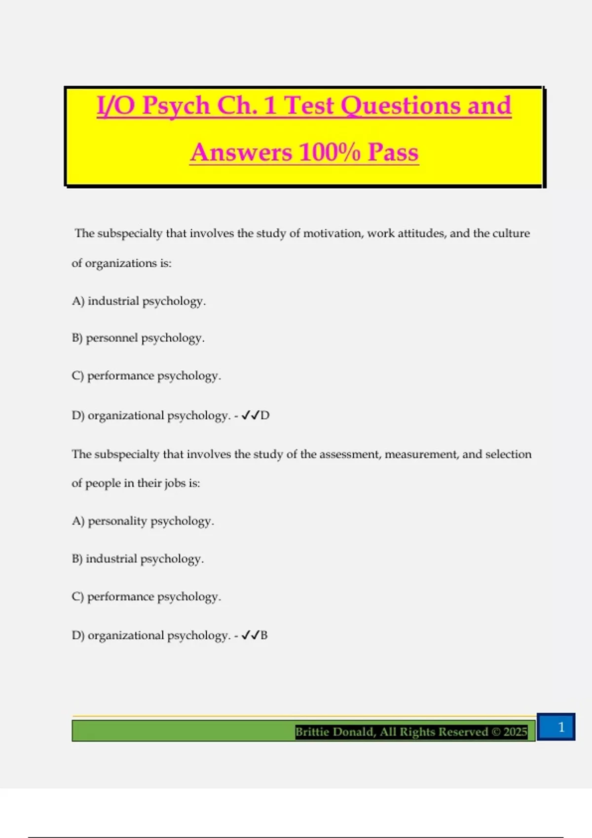 I/O Psych Ch. 1 Test Questions and Answers 100% Pass The subspecialty that involves the study of motivation, work attitudes, and the culture of organizations is: A) industrial psychology. B) personnel psychology. C) performance psychology. D) organizational psychology. - D The subspecialty that involves the study of the assessment, measurement, and selection of people in their jobs is: A) personality psychology. B) industrial psychology. C) performance psychology. D) organizational psychology. - B 2Brittie Donald, All Rights Reserved © 2025 Which of these is LEAST likely to be studied by an I/O psychologist whose emphasis is on the subspecialty of industrial psychology? A) employee training and development B) performance appraisal and selection C) work attitudes and behaviors D) job analysis and recruitment - C Which of these is MOST likely to be studied by an I/O psychologist whose emphasis is on the subspecialty of industrial psychology? A) leadership B) work attitudes C) motivation D) selection - D Which of these is LEAST likely to be studied by an I/O psychologist whose emphasis is on the subspecialty of organizational psychology? A) leadership B) work attitudes C) motivation 3Brittie Donald, All Rights Reserved © 2025 D) selection - D Which of these is MOST likely to be studied by an I/O psychologist whose emphasis is on the subspecialty of organizational psychology? A) performance appraisal B) selection C) job analysis D) leadership - D Janice, an I/O psychologist, spends most of her time designing tests to help her select new employees, train those new employees, and help managers conduct performance evaluations. Most of Janice's work would fall under the _____ subspecialty of I/O psychology. A) personality psychology B) industrial psychology C) organizational psychology D) selective psychology - B Dominic, an I/O psychologist, spends most of his time developing leaders, conducting surveys, gauging employee motivation and satisfaction, and ensuring his workers are 4Brittie Donald, All Rights Reserved © 2025 safe. Most of Dominic's work would fall under the _____ subspecialty of I/O psychology. A) personality psychology B) industrial psychology C) organizational psychology D) counseling psychology - C he textbook notes that the division between industrial and organizational psychology is somewhat artificial. What is one reason the t
