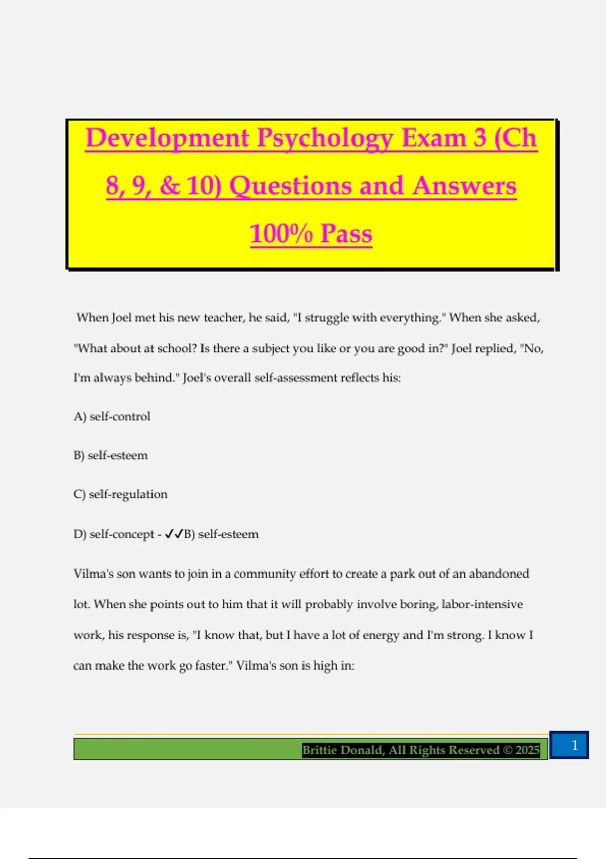 D) self-concept - ✔✔B) self-esteem