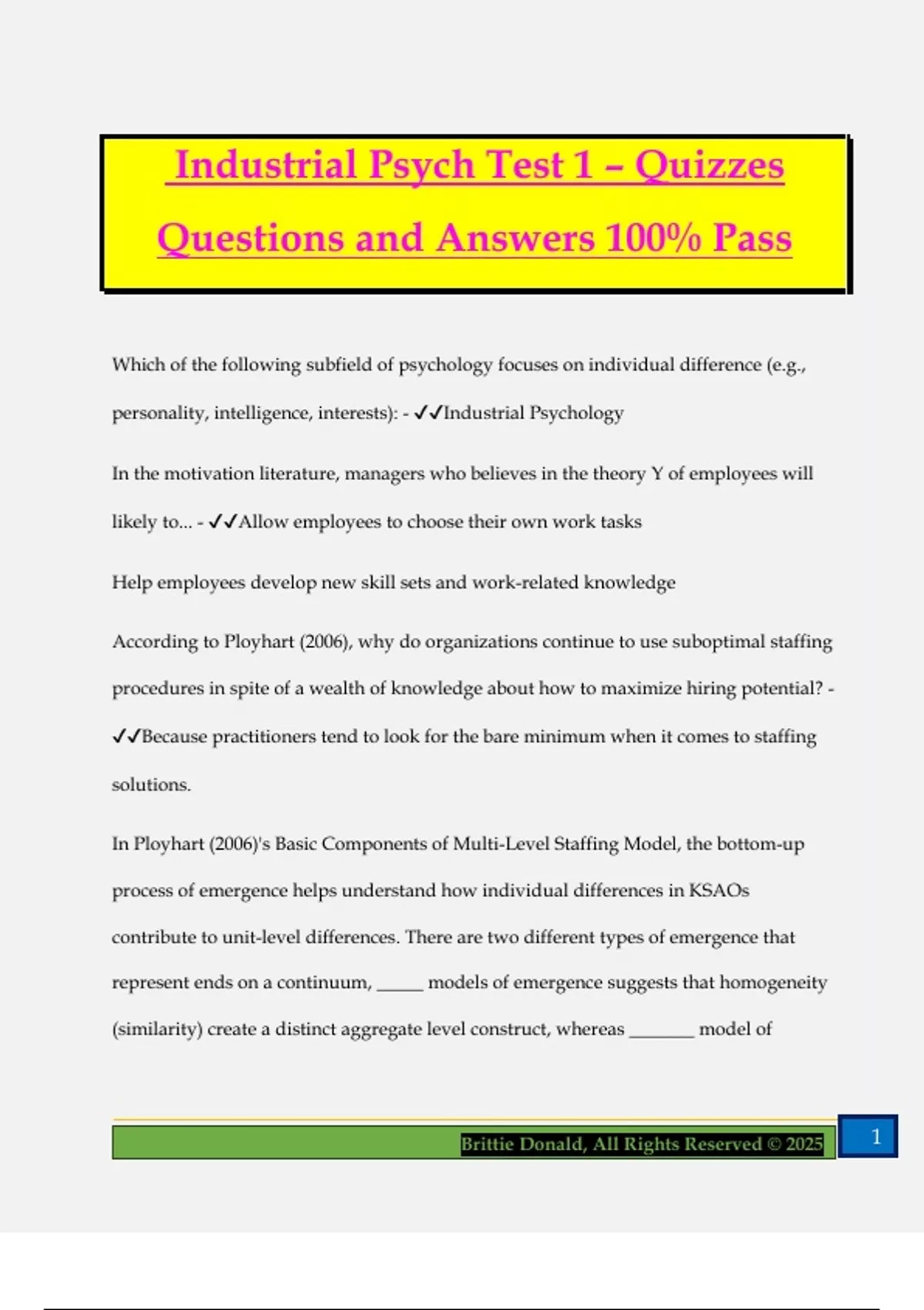 Industrial Psych Test 1 – Quizzes Questions and Answers 100% Pass Which of the following subfield of psychology focuses on individual difference (e.g., personality, intelligence, interests): - Industrial Psychology In the motivation literature, managers who believes in the theory Y of employees will likely to... - Allow employees to choose their own work tasks Help employees develop new skill sets and work-related knowledge According to Ployhart (2006), why do organizations continue to use suboptimal staffing procedures in spite of a wealth of knowledge about how to maximize hiring potential? - Because practitioners tend to look for the bare minimum when it comes to staffing solutions. In Ployhart (2006)'s Basic Components of Multi-Level Staffing Model, the bottom-up process of emergence helps understand how individual differences in KSAOs contribute to unit-level differences. There are two different types of emergence that represent ends on a continuum, _____ models of emergence suggests that homogeneity (similarity) create a distinct aggregate level construct, whereas _______ model of 2Brittie Donald, All Rights Reserved © 2025 emergence suggests that heterogeneity (diversity) create a distinct aggregate level construct. - composition; compilation To increase firm-level creativity, a silicone valley startup had put in place a new HR policy, which encouraged the hiring of college graduates with different majors. 6 months later, there was a 10% increase of non-engineering major in the company. This is an example of _________. As the KSAO diversity increased, the product team started to push out more creative technological solutions. This is an example of _________. - contextual effects; emergent effects The overall type of intelligence that refers to knowledge, skills, and experience accumulated over time is called: - crystallized intelligence When it comes to the challenges that modern HRM is facing , which of the following statement(s) is/are correct? - Employment laws an regulations are ever changing. Corporate merges and acquisitions are becoming