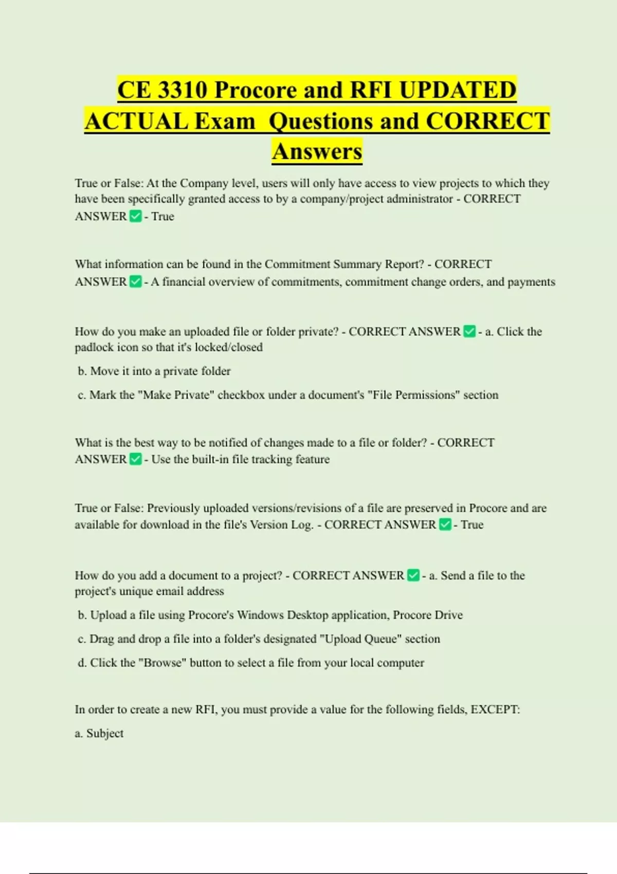 CE 3310 Procore and RFI UPDATED ACTUAL Exam Questions and CORRECT Answers