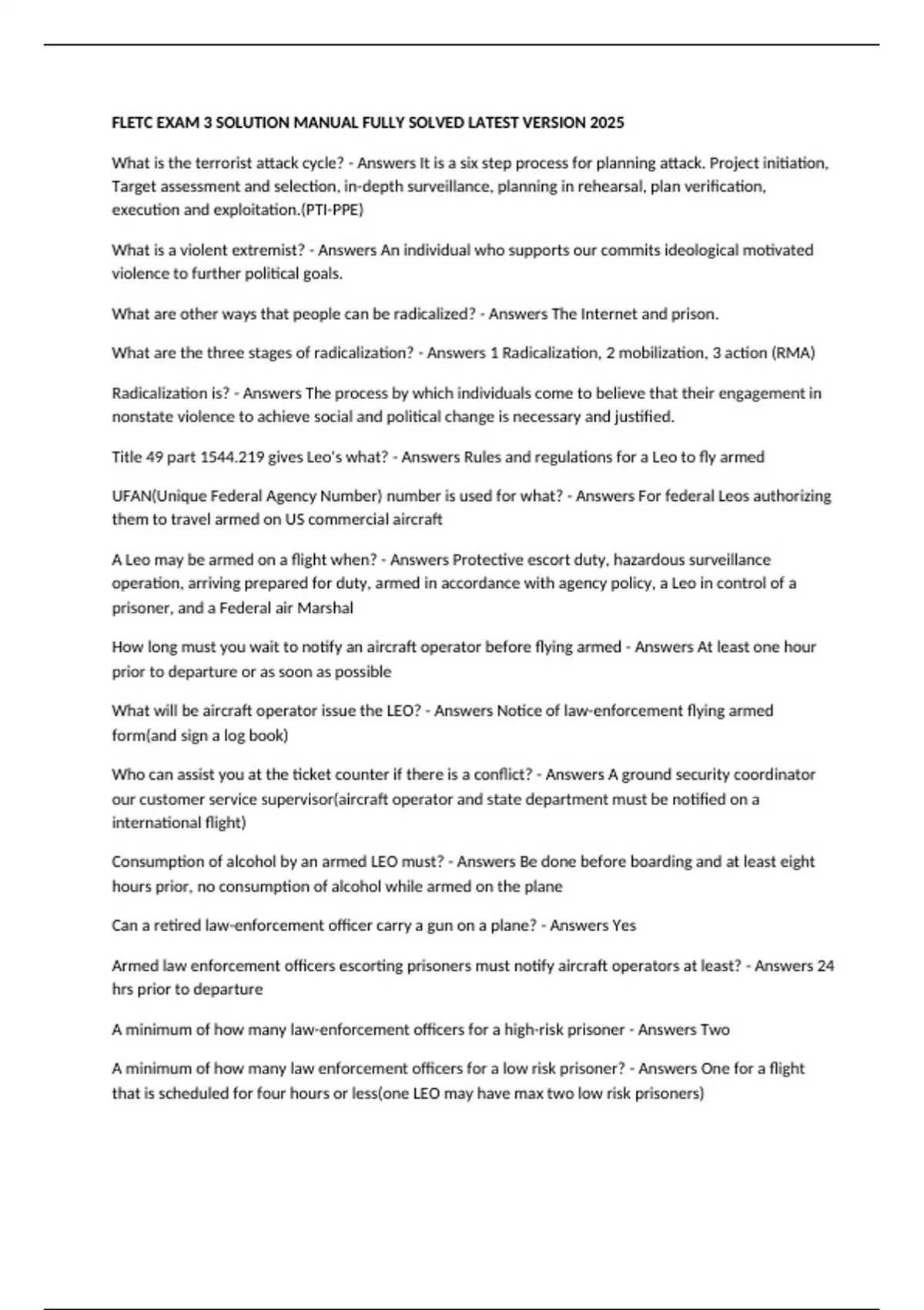 FLETC EXAM 3 SOLUTION MANUAL FULLY SOLVED LATEST VERSION 2025 What is the terrorist attack cycle? - Answers It is a six step process for planning attack. Project initiation, Target assessment and selection, in-depth surveillance, planning in rehearsal, plan verification, execution and exploitation.(PTI-PPE) What is a violent extremist? - Answers An individual who supports our commits ideological motivated violence to further political goals. What are other ways that people can be radicalized? - Answers The Internet and prison. What are the three stages of radicalization? - Answers 1 Radicalization, 2 mobilization, 3 action (RMA) Radicalization is? - Answers The process by which individuals come to believe that their engagement in nonstate violence to achieve social and political change is necessary and justified. Title 49 part 1544.219 gives Leo's what? - Answers Rules and regulations for a Leo to fly armed UFAN(Unique Federal Agency Number) number is used for what? - Answers For federal Leos authorizing them to travel armed on US commercial aircraft A Leo may be armed on a flight when? - Answers Protective escort duty, hazardous surveillance operation, arriving prepared for duty, armed in accordance with agency policy, a Leo in control of a prisoner, and a Federal air Marshal How long must you wait to notify an aircraft operator before flying armed - Answers At least one hour prior to departure or as soon as possible What will be aircraft operator issue the LEO? - Answers Notice of law-enforcement flying armed form(and sign a log book) Who can assist you at the ticket counter if there is a conflict? - Answers A ground security coordinator our customer service supervisor(aircraft operator and state department must be notified on a international flight) Consumption of alcohol by an armed LEO must? - Answers Be done before boarding and at least eight hours prior, no consumption of alcohol while armed on the plane Can a retired law-enforcement officer carry a gun on a plane? - Answers Yes Armed law enforcement officers escorting prisoners must notify aircraft operators at least? - Answers 24 hrs prior to departure A minimum of how many law-enforcement officers for a high-risk prisoner - Answers Two A minimum of how many law enforcement officers for a low risk prisoner? - Answers One for a flight that is scheduled for four hours or less(one LEO may have max two low risk prisoners) A minimum of how many law enforcement officers for a low risk prisoner more than four hours? - Answers Two( two LEOs may have a max of two low risk prisoners) Where should a prisoner be placed on a plane. - Answers seat the prisoner on the rearmost seat of the aircraft, not by and exit door, and LEO must be seated between the prisoner and the isle of the aircraft All criminal acts in the US are? - Answers Statutes That are acts or omissions prohibited by la
