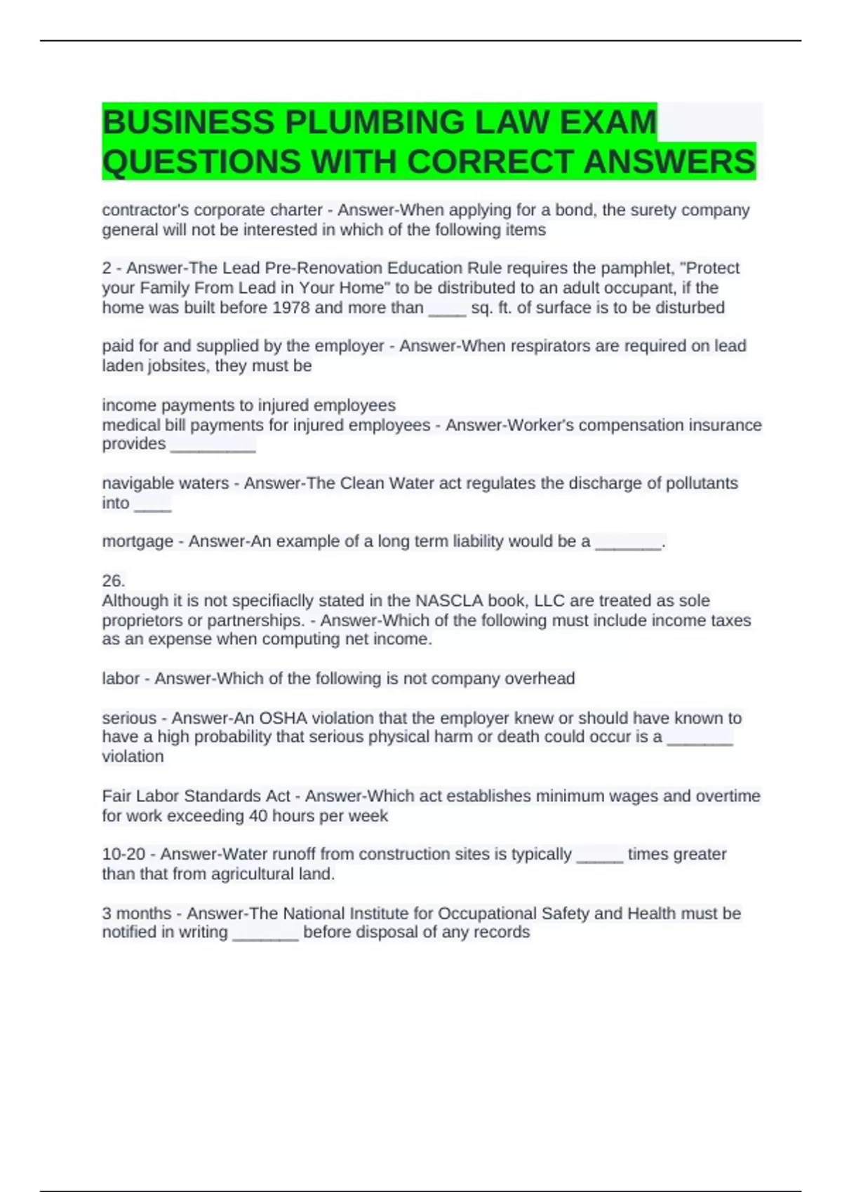 BUSINESS PLUMBING LAW EXAM