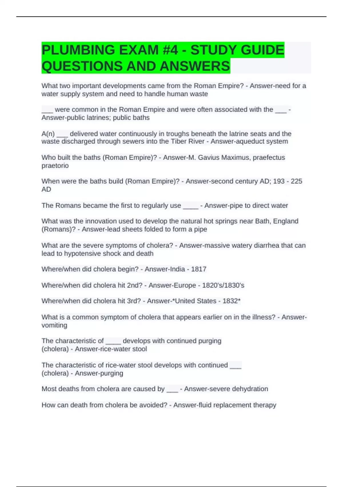 PLUMBING EXAM #4 - STUDY GUIDE QUESTIONS AND ANSWERS