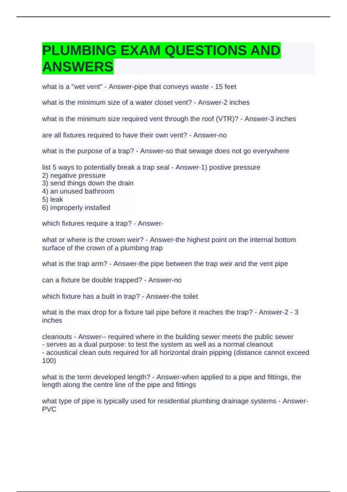 PLUMBING EXAM QUESTIONS AND