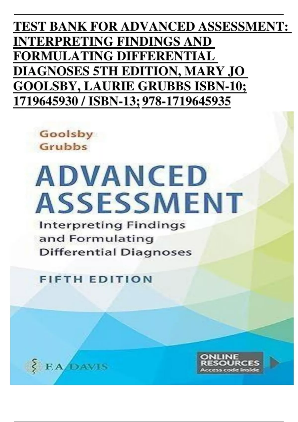 TEST BANK FOR ADVANCED ASSESSMENT: INTERPRETING FINDINGS AND FORMULATING DIFFERENTIAL DIAGNOSES 5th Edition by Goolsby