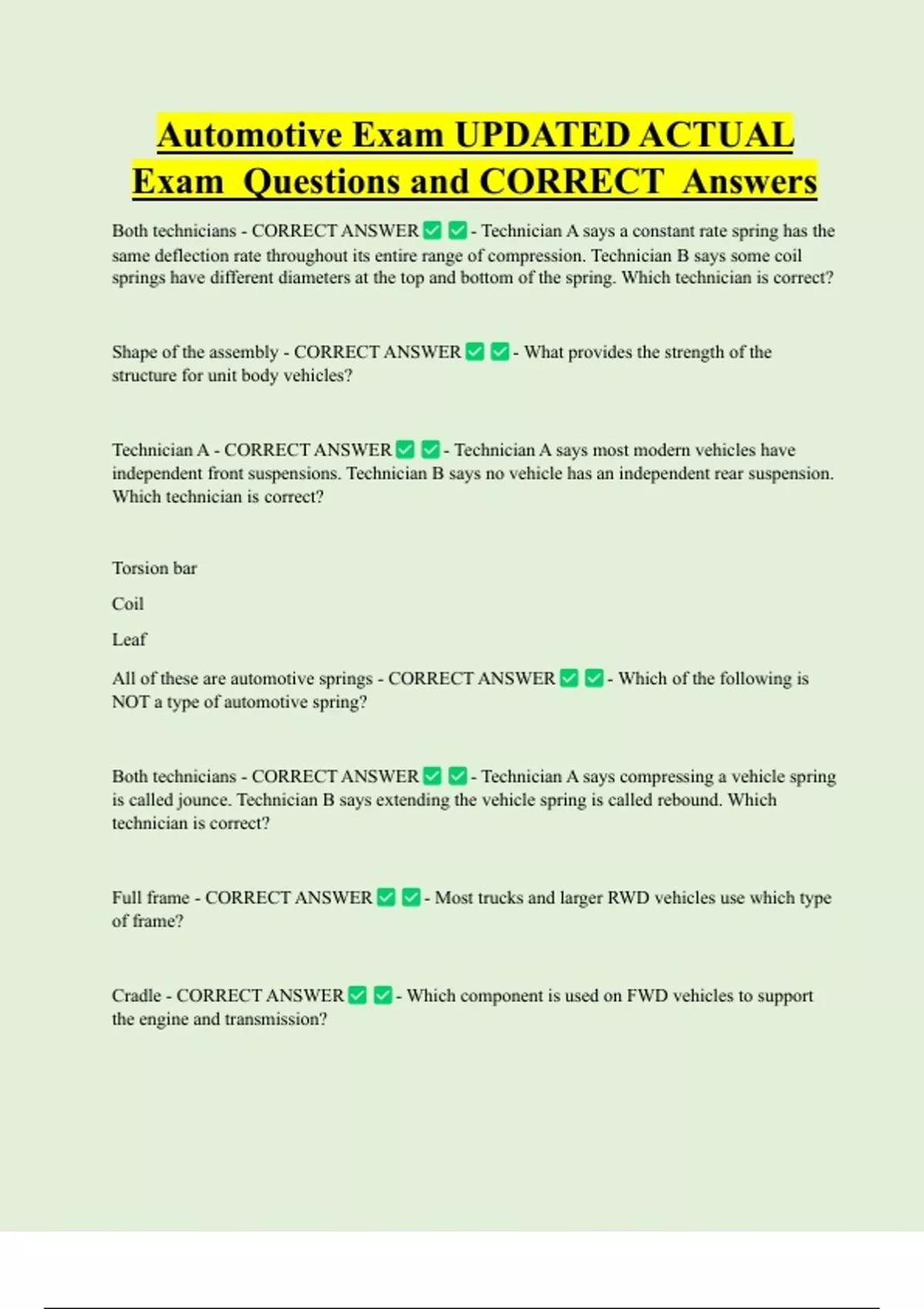 Automotive Exam UPDATED ACTUAL Exam Questions and CORRECT Answers Both technicians - CORRECT ANSWER - Technician A says a constant rate spring has the same deflection rate throughout its entire range of compression. Technician B says some coil springs have different diameters at the top and bottom of the spring. Which technician is correct? Shape of the assembly - CORRECT ANSWER - What provides the strength of the structure for unit body vehicles?