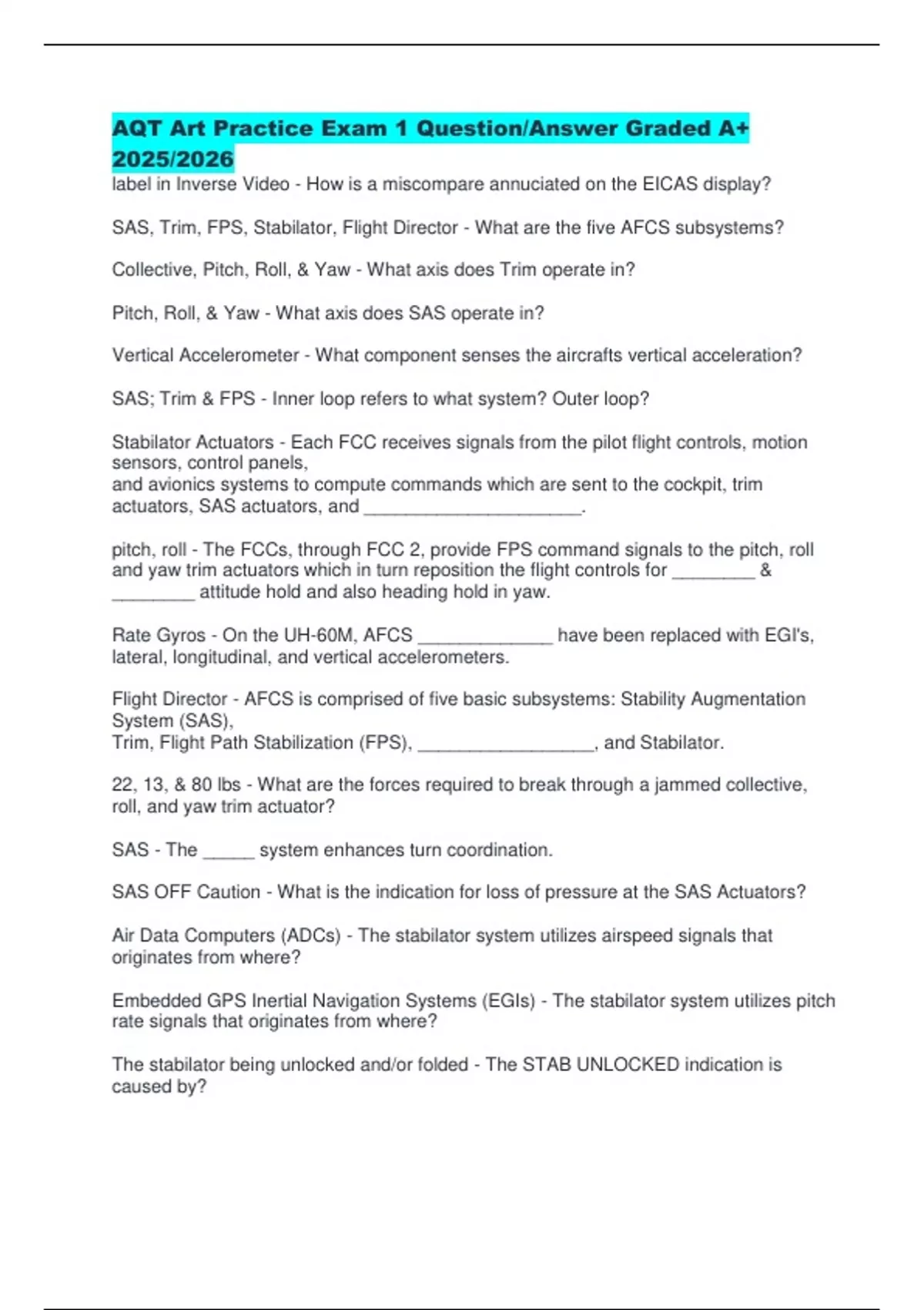 AQT Art Practice Exam 1 Question/Answer Graded A+ 2025/2026 label in Inverse Video - How is a miscompare annuciated on the EICAS display? SAS, Trim, FPS, Stabilator, Flight Director - What are the five AFCS subsystems? Collective, Pitch, Roll, & Yaw - What axis does Trim operate in? Pitch, Roll, & Yaw - What axis does SAS operate in? Vertical Accelerometer - What component senses the aircrafts vertical acceleration? SAS; Trim & FPS - Inner loop refers to what system? Outer loop? Stabilator Actuators - Each FCC receives signals from the pilot flight controls, motion sensors, control panels, and avionics systems to compute commands which are sent to the cockpit, trim actuators, SAS actuators, and _____________________. pitch, roll - The FCCs, through FCC 2, provide FPS command signals to the pitch, roll and yaw trim actuators which in turn reposition the flight controls for ________ & ________ attitude hold and also heading hold in yaw. Rate Gyros - On the UH-60M, AFCS _____________ have been replaced with EGI's, lateral, longitudinal, and vertical accelerometers.