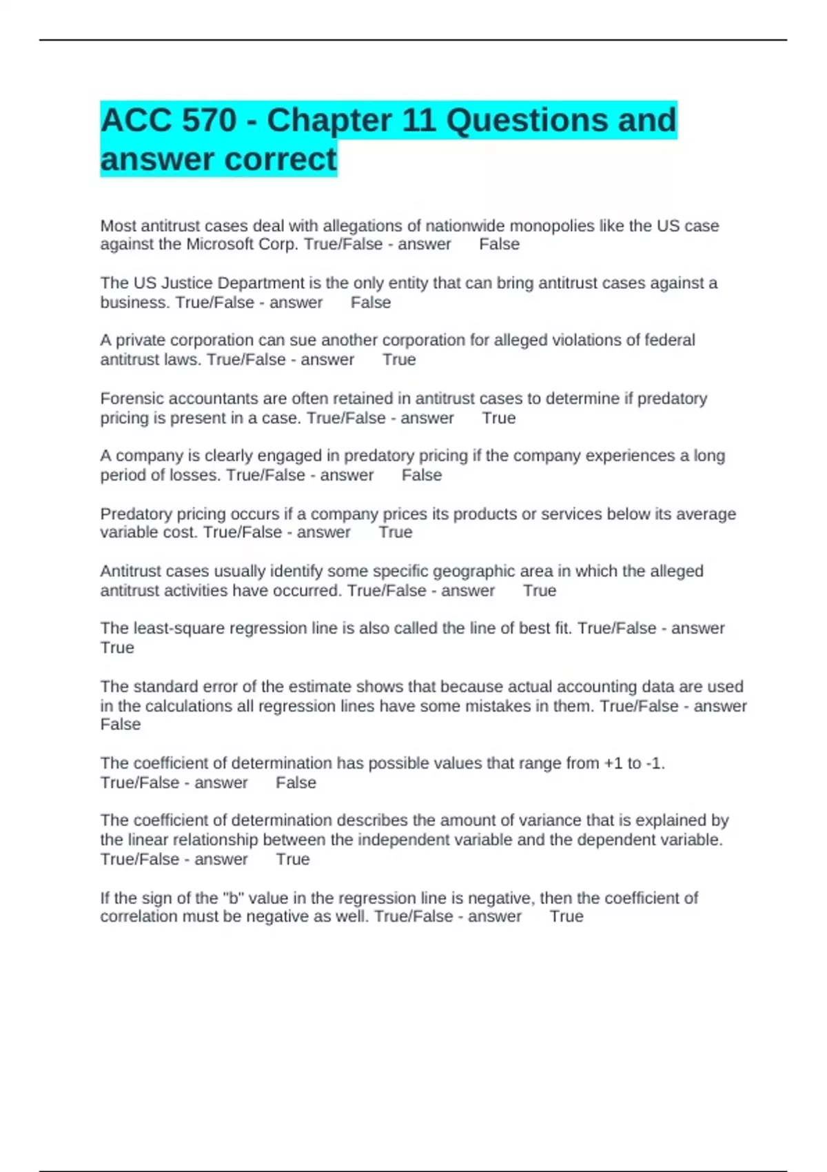 ACC 570 - Chapter 11 Questions and answer correct Most antitrust cases deal with allegations of nationwide monopolies like the US case against the Microsoft Corp. True/False False The US Justice Department is the only entity that can bring antitrust cases against a business. True/False False A private corporation can sue another corporation for alleged violations of federal antitrust laws. True/False True Forensic accountants are often retained in antitrust cases to determine if predatory pricing is present in a case. True/False True A company is clearly engaged in predatory pricing if the company experiences a long period of losses. True/False False Predatory pricing occurs if a company prices its products or services below its average variable cost. True/False True Antitrust cases usually identify some specific geographic area in which the alleged antitrust activities have occurred. True/False True The least-square regression line is also called the line of best fit. True/False True The standard error of the estimate shows that because actual accounting data are used in the calculations all regression lines have some mistakes in them. True/False False The coefficient of determination has possible values that range from +1 to -1. True/False False The coefficient of determination describes the amount of variance that is explained by the linear relationship between the independent variable and the dependent variable. True/False True If the sign of the "b" value in the regression line is negative, then the coefficient of correlation must be negative as well. True/False True If a company is found liable under federal antitrust laws, the damages to the harmed company in the suit would be equal to the losses that company incurred during the time period covered by the suit. True/False False Often local or industry economic conditions are key factors in estimating damages in antitrust cases. True/False True Proving fraud under the Federal False Claims Act uses the same standard for fraud as in any other civil fraud case. True/False False Qui tam suits allowing individuals to file suit on behalf of the federal government were actually created during the Civil War and signed into law by President Abraham Lincoln. True/False True Sometimes whistle-blowers receive a lot of money for their rule in exposing fraud against the government. True/False True Most whistle-blowers become quite wealthy from their act of exposing fraud against their former employer. True/False False if fraud is found in Federal Fraudulent Claims Act case, the amount of damages found may be tripled. True/False True Federal False Claims Act cases, although interesting, seldom involve many accounting or cost issues. True/False False Association and causation are two terms that mean the same thing when used in connection with regression/correlation analysis. True/False False Regression/correlation analysis is a very powerful tool in assessing cost behavior characteristics of accounting information. True/False True