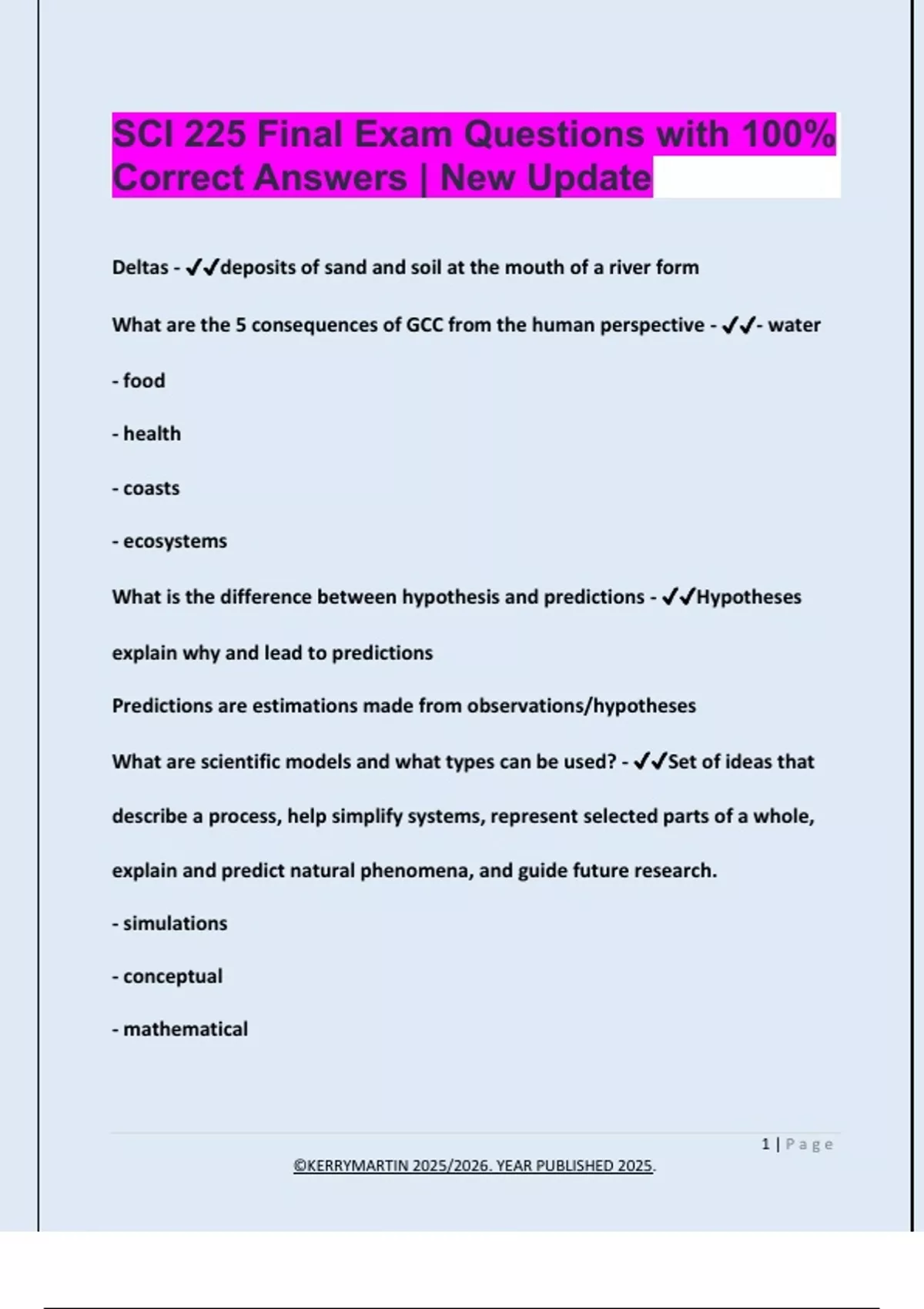 SCI 225 Final Exam Questions with 100% Correct Answers | New Update Deltas - deposits of sand and soil at the mouth of a river form What are the 5 consequences of GCC from the human perspective - - water - food - health - coasts - ecosystems What is the difference between hypothesis and predictions - Hypotheses explain why and lead to predictions Predictions are estimations made from observations/hypotheses What are scientific models and what types can be used? - Set of ideas that describe a process, help simplify systems, represent selected parts of a whole, explain and predict natural phenomena, and guide future research. - simulations - conceptual - mathematica