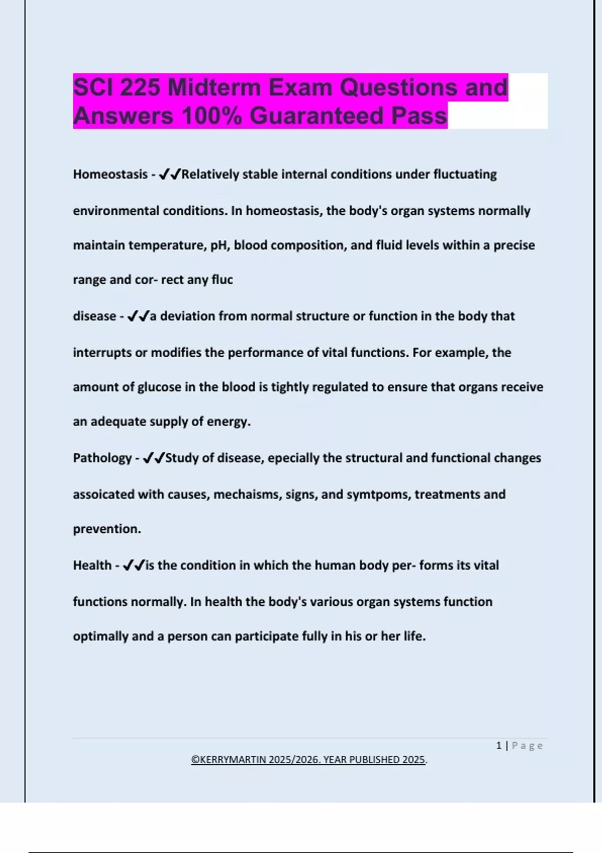 SCI 225 Midterm Exam Questions and Answers 100% Guaranteed Pass Homeostasis - Relatively stable internal conditions under fluctuating environmental conditions. In homeostasis, the body's organ systems normally maintain temperature, pH, blood composition, and fluid levels within a precise range and cor- rect any fluc disease - a deviation from normal structure or function in the body that interrupts or modifies the performance of vital functions. For example, the amount of glucose in the blood is tightly regulated to ensure that organs receive an adequate supply of energy. Pathology - Study of disease, epecially the structural and functional changes assoicated with causes, mechaisms, signs, and symtpoms, treatments and prevention. Health - is the condition in which the human body per- forms its vital functions normally. In health the body's various organ systems function optimally and a person can participate fully in his or her life