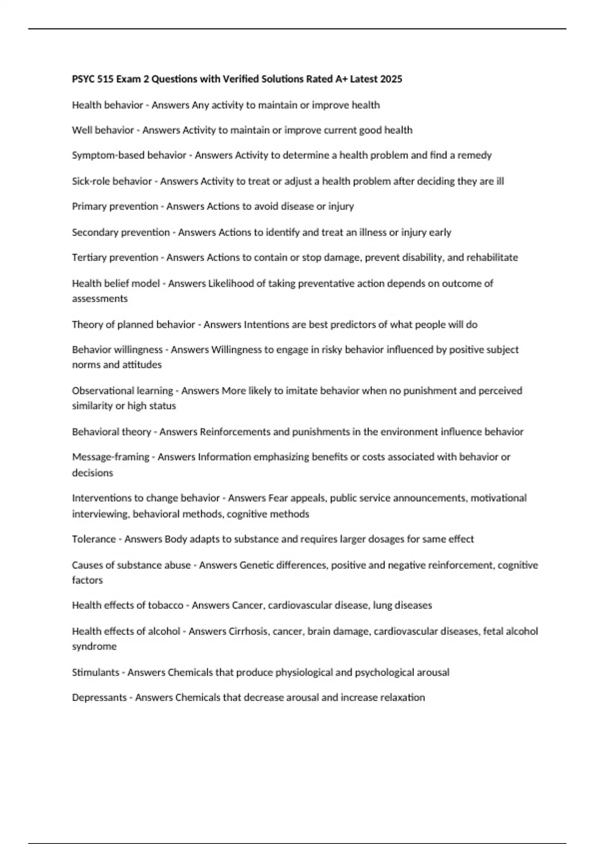 PSYC 515 Exam 2 Questions with Verified Solutions Rated A+ Latest 2025 Health behavior - Answers Any activity to maintain or improve health Well behavior - Answers Activity to maintain or improve current good health Symptom-based behavior - Answers Activity to determine a health problem and find a remedy Sick-role behavior - Answers Activity to treat or adjust a health problem after deciding they are ill Primary prevention - Answers Actions to avoid disease or injury Secondary prevention - Answers Actions to identify and treat an illness or injury early Tertiary prevention - Answers Actions to contain or stop damage, prevent disability, and rehabilitate Health belief model - Answers Likelihood of taking preventative action depends on outcome of assessments Theory of planned behavior - Answers Intentions are best predictors of what people will do Behavior willingness - Answers Willingness to engage in risky behavior influenced by positive subject norms and attitudes Observational learning - Answers More likely to imitate behavior when no punishment and perceived similarity or high status Behavioral theory - Answers Reinforcements and punishments in the environment influence behavior Message-framing - Answers Information emphasizing benefits or costs associated with behavior or decisions Interventions to change behavior - Answers Fear appeals, public service announcements, motivational interviewing, behavioral methods, cognitive methods Tolerance - Answers Body adapts to substance and requires larger dosages for same effect Causes of substance abuse - Answers Genetic differences, positive and negative reinforcement, cognitive factors Health effects of tobacco - Answers Cancer, cardiovascular disease, lung diseases Health effects of alcohol - Answers Cirrhosis, cancer, brain damage, cardiovascular diseases, fetal alcohol syndrome Stimulants - Answers Chemicals that produce physiological and psychological arousal Depressants - Answers Chemicals that decrease arousal and increase relaxation Hallucinogens - Answers Chemicals that produce perceptual distortions Narcotics - Answers Sedatives that relieve pain and produce a relaxed feeling Treatments for substance problems - Answers Biological treatment, psychological treatment Types of health services - Answers Hospitals, nursing homes, outpatient or home health Types of insurance in the US - Answers Medicaid, Medicare, Free-for-service, Managed care