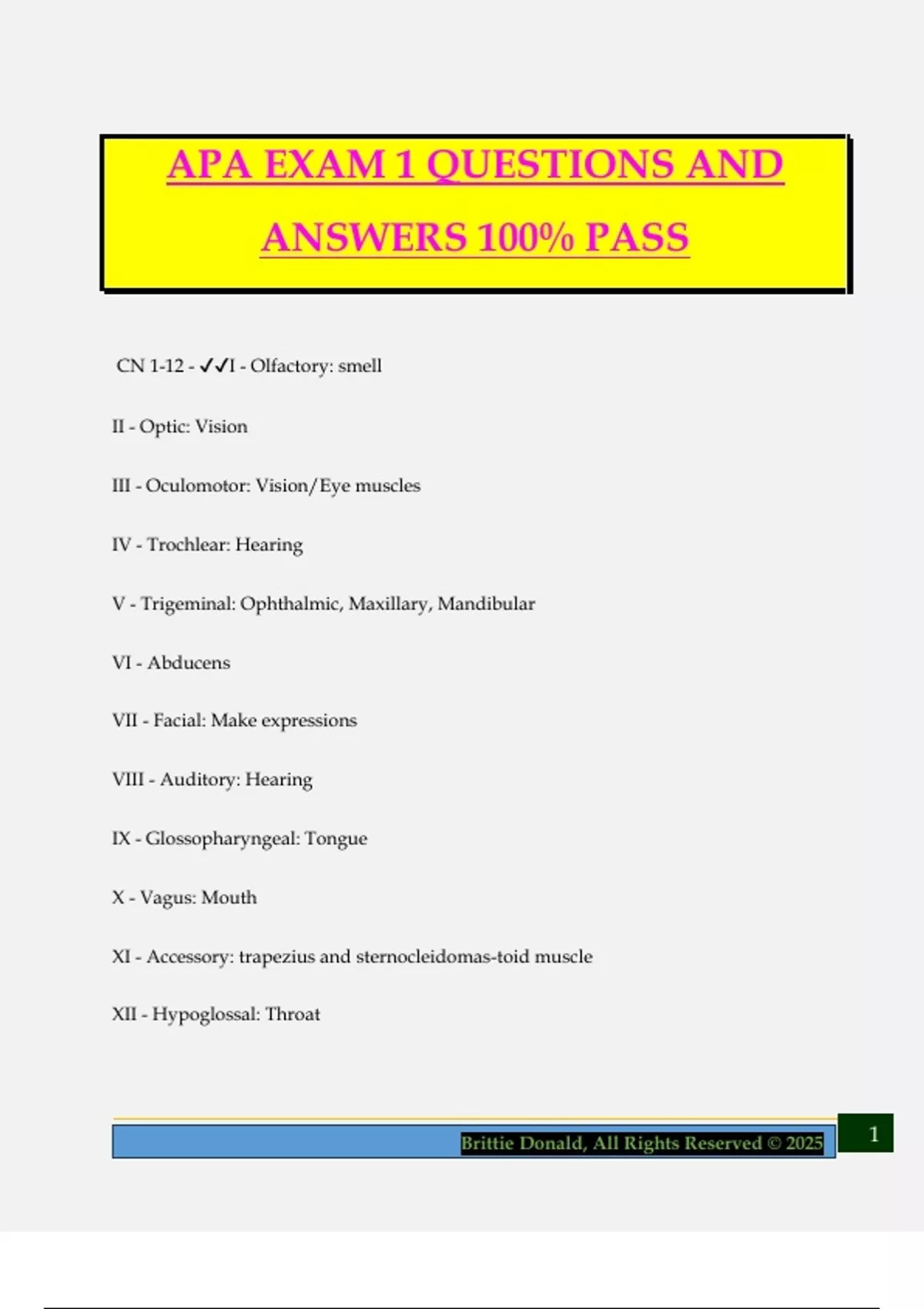 APA EXAM 1 QUESTIONS AND ANSWERS 100% PASS CN 1-12 - I - Olfactory: smell II - Optic: Vision III - Oculomotor: Vision/Eye muscles IV - Trochlear: Hearing V - Trigeminal: Ophthalmic, Maxillary, Mandibular VI - Abducens VII - Facial: Make expressions VIII - Auditory: Hearing IX - Glossopharyngeal: Tongue X - Vagus: Mouth XI - Accessory: trapezius and sternocleidomas-toid muscle XII - Hypoglossal: Throat 2Brittie Donald, All Rights Reserved © 2025 What 5 things should you ask about while getting the health history of the head and neck? - 1. Headaches: - If yes, important to take a good headache history 2. Dizziness: - Does it interfere with their ADL/IADL especially for elderly. - Does the room spin or do you feel your head is spinning (dizziness or vertigo). - Differentiate between lightheadedness and feeling dizzy 3. Injury: - Type of injury, hx of concussion or traumatic brain injury, surgery, MVA 4. Lymph Nodes - Lumps or swelling in nec
