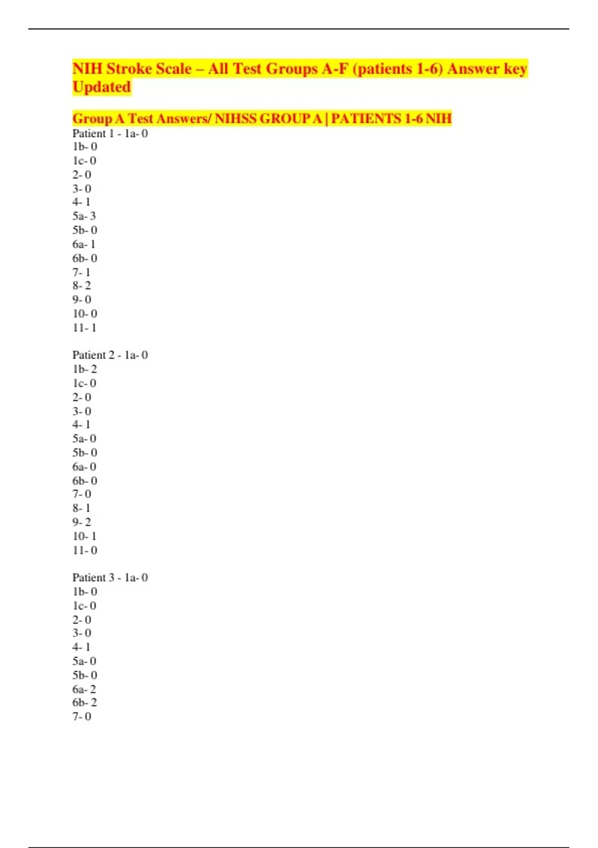 Group A Test Answers/ NIHSS GROUP A | PATIENTS 1-6 NIH