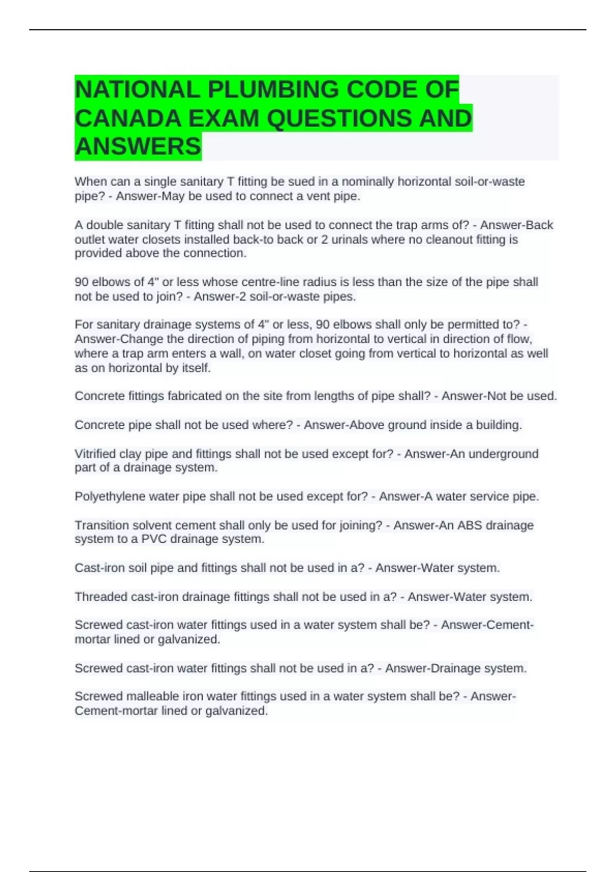 NATIONAL PLUMBING CODE OF CANADA EXAM QUESTIONS AND ANSWERS