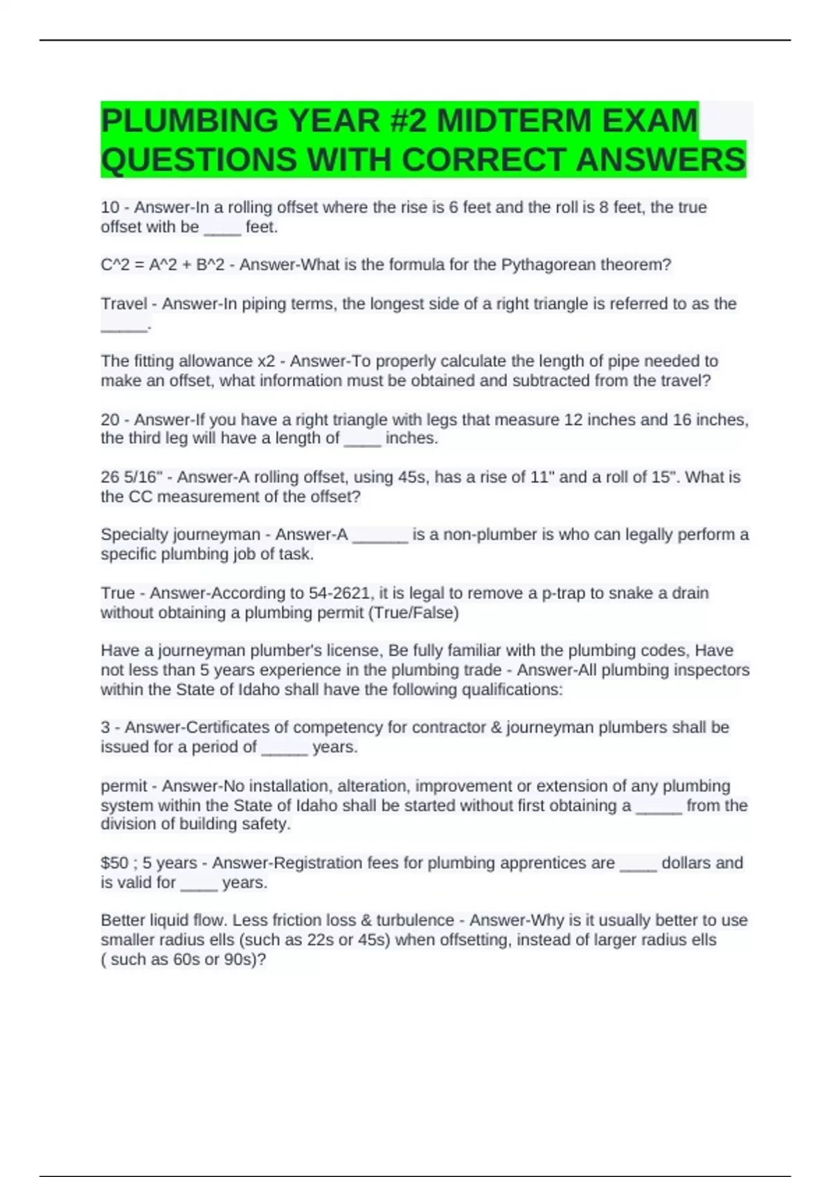 PLUMBING YEAR #2 MIDTERM EXAM QUESTIONS WITH CORRECT ANSWERS
