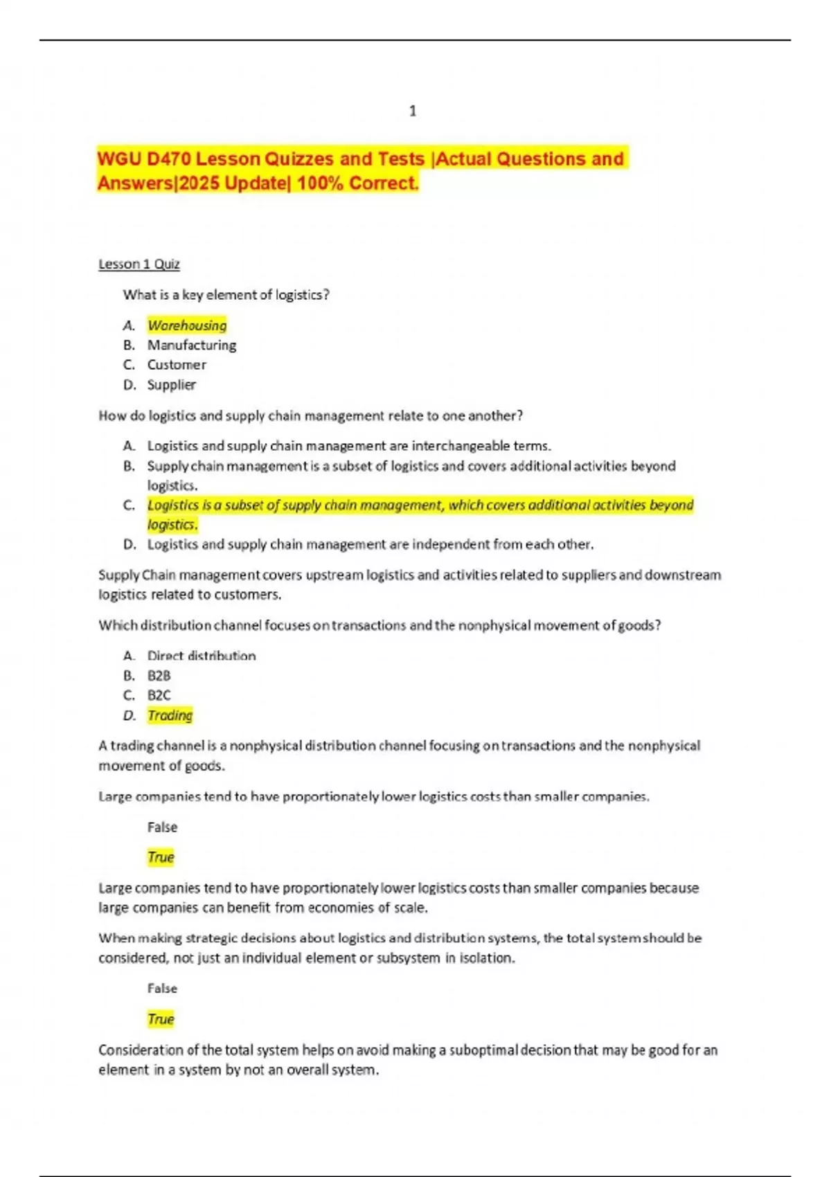 WGU D470 Lesson Quizzes and Tests |Actual Questions and Answers|2025 Update| 100% Correct Transportation, Logistics, and Distribution (D470)