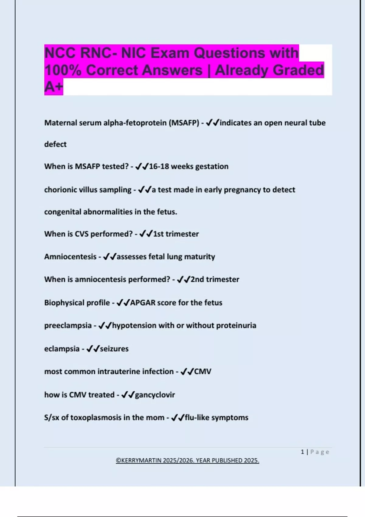 NCC RNC- NIC Exam Questions with 100% Correct Answers | Already Graded A+ Maternal serum alpha-fetoprotein (MSAFP) - indicates an open neural tube defect When is MSAFP tested? - 16-18 weeks gestation chorionic villus sampling - a test made in early pregnancy to detect congenital abnormalities in the fetus. When is CVS performed? - 1st trimester Amniocentesis - assesses fetal lung maturity When is amniocentesis performed? - 2nd trimester Biophysical profile - APGAR score for the fetus preeclampsia - hypotension with or without proteinuria eclampsia - seizures most common intrauterine infection - CMV how is CMV treated - gancyclovir S/sx of toxoplasmosis in the mom - flu-like symptoms