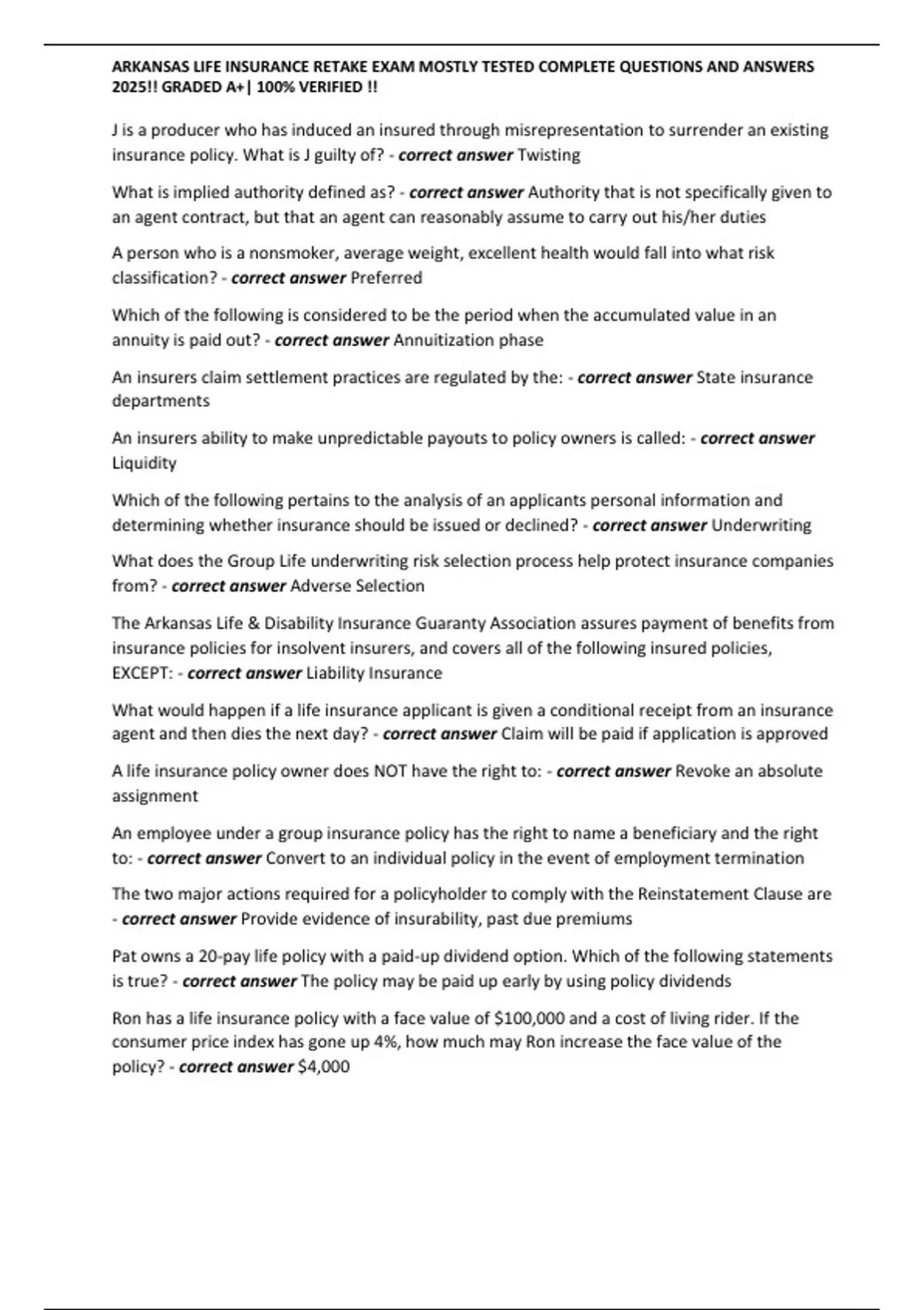 ,ARKANSAS LIFE INSURANCE RETAKE EXAM MOSTLY TESTED COMPLETE QUESTIONS AND ANSWERS