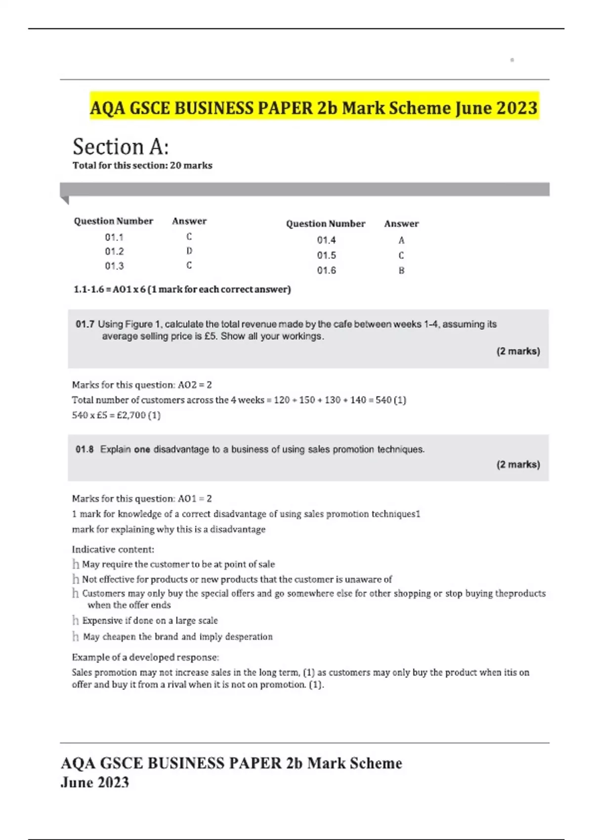AQA GSCE BUSINESS PAPER 2b Mark Scheme June 2023