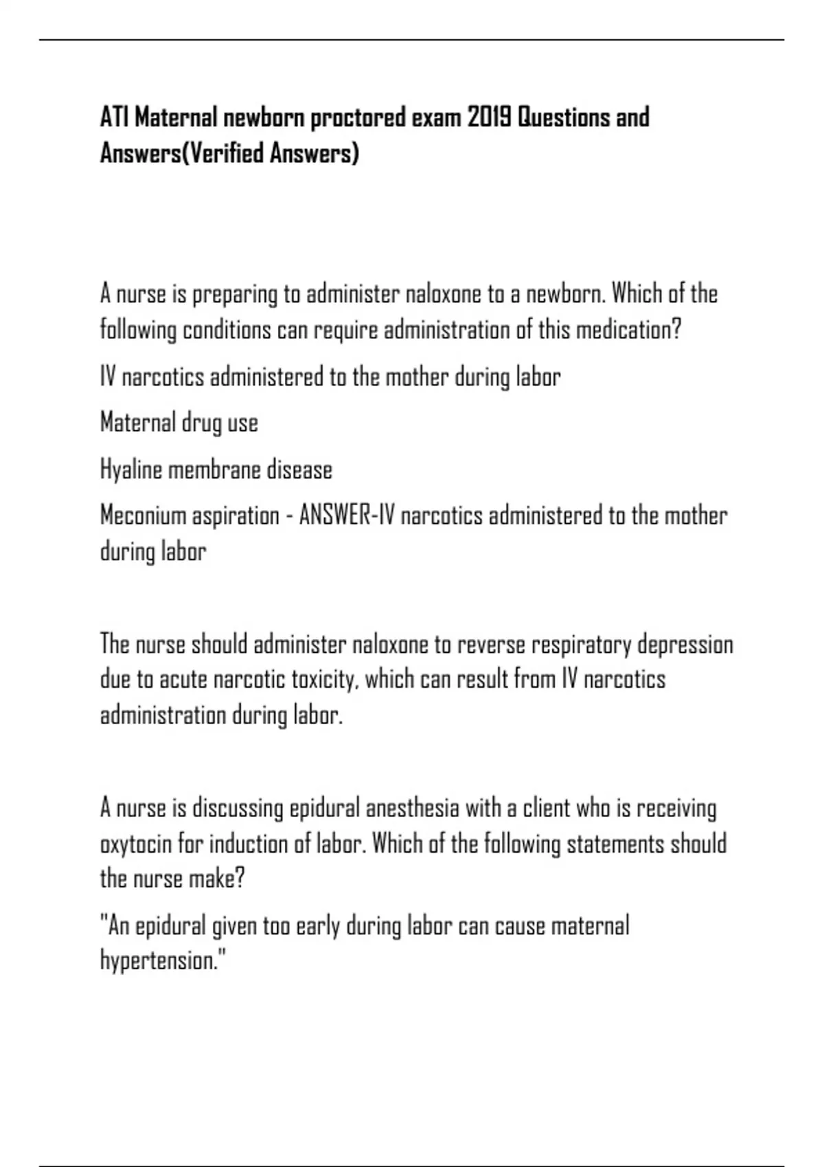 ATI Maternal newborn proctored exam 2019 Questions and Answers(Verified Answers) A nurse is preparing to administer naloxone to a newborn. Which of the following conditions can require administration of this medication? IV narcotics administered to the mother during labor Maternal drug use Hyaline membrane disease Meconium aspiration - ANSWER-IV narcotics administered to the mother during labor The nurse should administer naloxone to reverse respiratory depression due to acute narcotic toxicity, which can result from IV narcotics administration during labor. A nurse is discussing epidural anesthesia with a client who is receiving oxytocin for induction of labor. Which of the following statements should the nurse make? "An epidural given too early during labor can cause maternal hypertension." "An epidural given too early during labor will not be effective in active labor." "An epidural given too early can cause fetal depression." "An epidural given too early can prolong labor." - ANSWER-An epidural given too early can prolong labor Clients who receive anesthesia before the active phase of labor usually find the progression of their labor to slow. The medication depresses the central nervous system. Therefore, it will take longer for the cervix to dilate and efface. A nurse is caring for a client who is pregnant and reports nausea and vomiting. Which of the following instructions should the nurse provide the client? "You should eat some crackers before rising from bed in the morning." "You should eat foods served at warm temperatures." "You should sip whole milk with breakfast." "You should brush your teeth immediately after meals." - ANSWER-You should eat some crackers before rising from bed in the morning