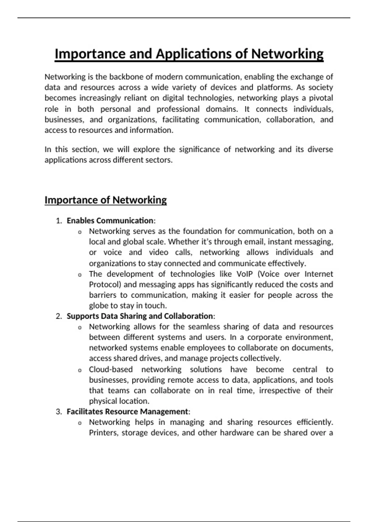 o Networking helps in managing and sharing resources efficiently.