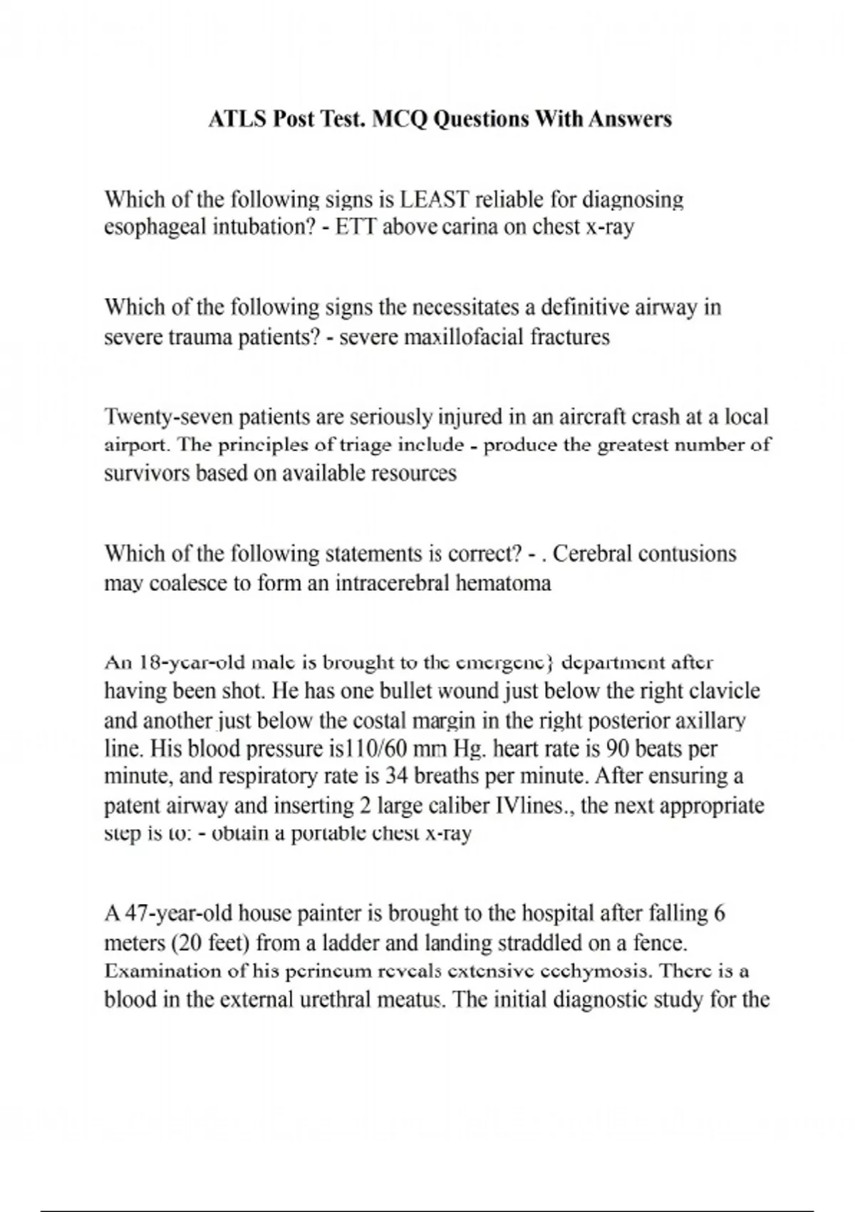 Which of the following signs is LEAST reliable for diagnosing esophageal intubation? - ETT above carina on chest x-ray Which of the following signs the necessitates a definitive airway in severe trauma patients? - severe maxillofacial fractures Twenty-seven patients are seriously injured in an aircraft crash at a local airport. The principles of triage include - produce the greatest number of survivors based on available resources Which of the following statements is correct? - . Cerebral contusions may coalesce to form an intracerebral hematoma An 18-ycar-old male is brought to the emergenc} department after having been shot. He has one bullet wound just below the right clavicle and another just below the costal margin in the right posterior axillary line. His blood pressure is110/60 mm Hg. heart rate is 90 beats per minute, and respiratory rate is 34 breaths per minute. After ensuring a patent airway and inserting 2 large caliber IVlines., the next appropriate step is to: - obtain a portable chest x-ray A 47-year-old house painter is brought to the hospital after falling 6 meters (20 feet) from a ladder and landing straddled on a fence. Examination of his perineum reveals extensive ecchymosis. There is a blood in the external urethral meatus. The initial diagnostic study for the evaluation of the urinary tract in this patient should be: - . retrograde urethrography Neurogenic shock has all of the following classic characteristics except which one? - narrowed pulse pressure Which one of the following statements is false concerning Rh isoimmunization in pregnant trauma patients? - Rh immunoglobulin therapy should be administered to pregnant females who have sustained a gunshot wound to the leg. An 18-year-old motorcyclist sustains massive facial injuries in a head-on crash with a pick-up truck. He is brought to the emergency department completely immobilized on a long spine board and wearing a cervical collar. His blood pressure is 150/88 mmHg, heart rate is 88 beats per minute and regular, and respiratory rate is 26 breaths per minute. His respirations are labored and sonorous. His Glasgow Coma Scale score is 7. Attempts at orotracheal intubation with manual inline stabi - surgical cricothyroidotomy a 25-year-old male is brought to the hospital after sustaining partial and full-thickness burns involving 60% of his body surface area. His right arm and hand are severely burned. There are obvious full-thickness burns of the entire right hand and a circumferential burn of the right arm. Pulses are absent at the right wrist and are not detected by Doppler examination. The first step management of the right upper extremity should be: - escharotomy All of the following signs on the chest x-ray of a patient who sustained a blunt injury may suggest aortic rupture except which one? - a. mediastinal emphysema A 30-year-old woman fell down four stairs landing on concrete. Witnesses report she was unconscious for five minutes beginning immediately after the fall. Swith a Glasgow Coma Scale score of 15. Her only complaint is a slight headache. Thirty minutes later, she becomes unresponsive with a Glasgow Coma Scale score of 6. On the exam, her left pupil is large and non-reactive. The right pupil is normal. The one type of neurological injury most consistent with this patient's e - b. an epidural hematoma A 24-year-old male pedestrian, struck by an automobile, is admitted to the emergency department 1 hour after injury. His blood pressure is 80/60 mmHg, heart rate is 140 beats per minute, and respiratory rate is 36 breaths per minute. He is lethargic. Oxygen is delivered via face mask, and two large-caliber IVs are initiated. Arterial blood gases are obtained. His PaO2 is - restoration of normal perfusion Which of the following should be performed first in any patient whose injuries may include multiple closed extremity fractures? - . Ensuring adequate oxygenation and ventilation A 30-year-old male sustains a gunshot wound to the right lower chest, . He is brought by ambulance to a hospital that has full surgical capabilities. In the emergency department he is endotracheally intubated, 2 liters of crystalloid solution are infused rapidly through two large IV,a closed tube thoracost the return of 200 mL of blood. A chest x-ray