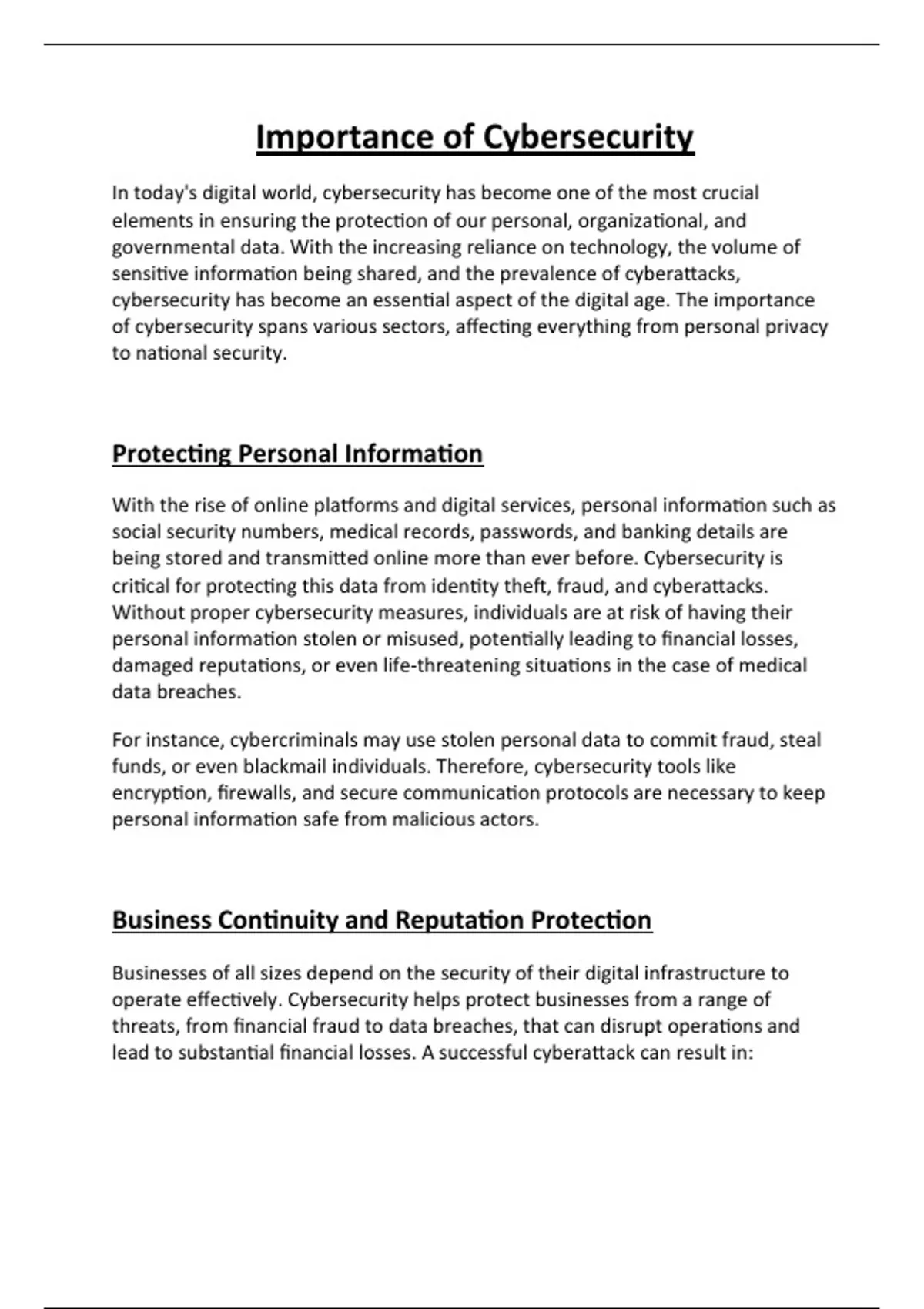 operate effectively. Cybersecurity helps protect businesses from a range of