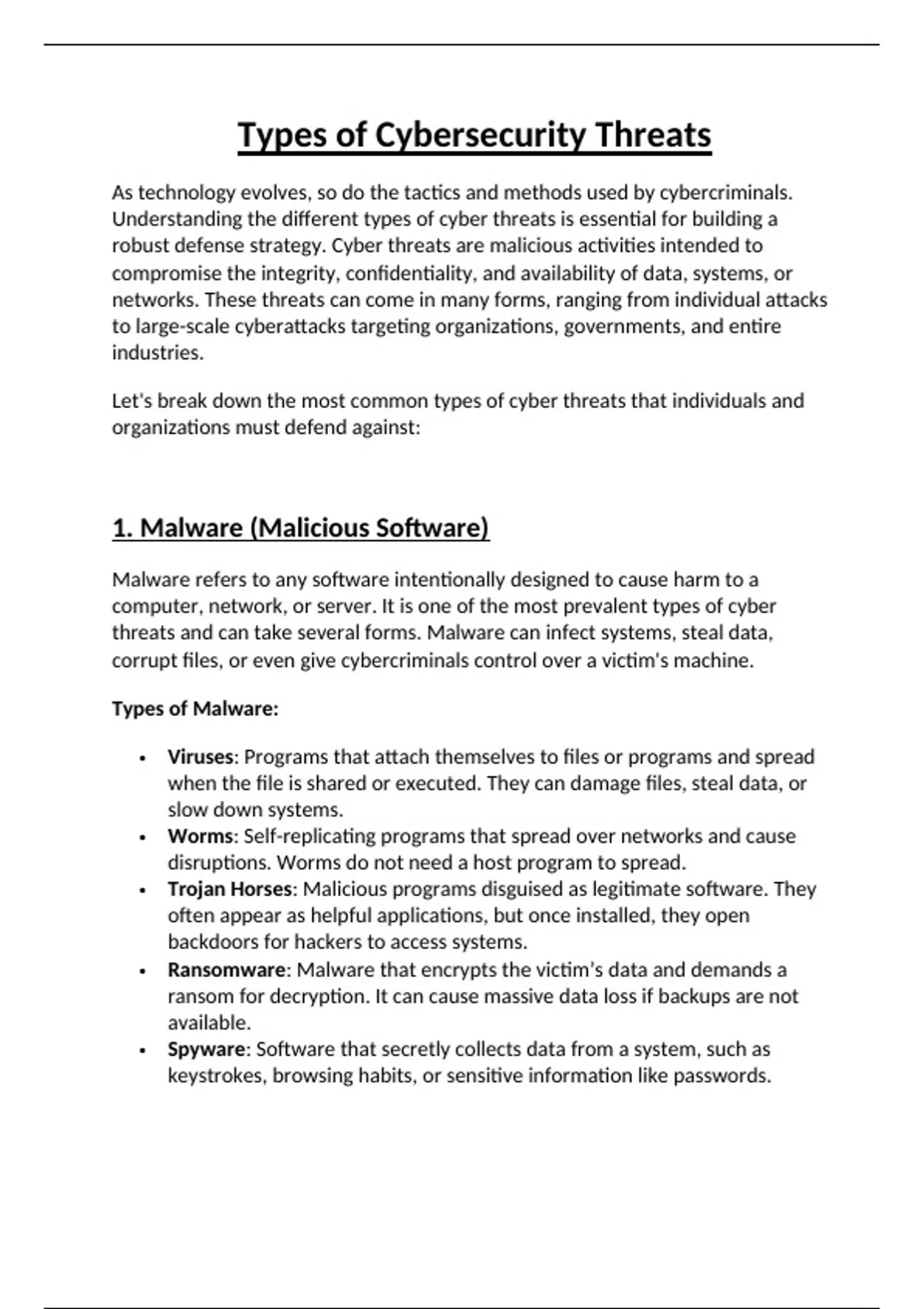 This document outlines the various types of cybersecurity threats that pose risks to digital systems and data. It covers the most common threats such as malware, phishing, ransomware, and Trojan horses, along with spyware and Distributed Denial of Service (DDoS) attacks. The guide also explores the causes of data breaches, hacking, and how to identify, mitigate, and defend against these threats. Ideal for students studying cybersecurity, this document provides essential knowledge on how to recognize and protect against common cyber threats in today’s digital landscape.