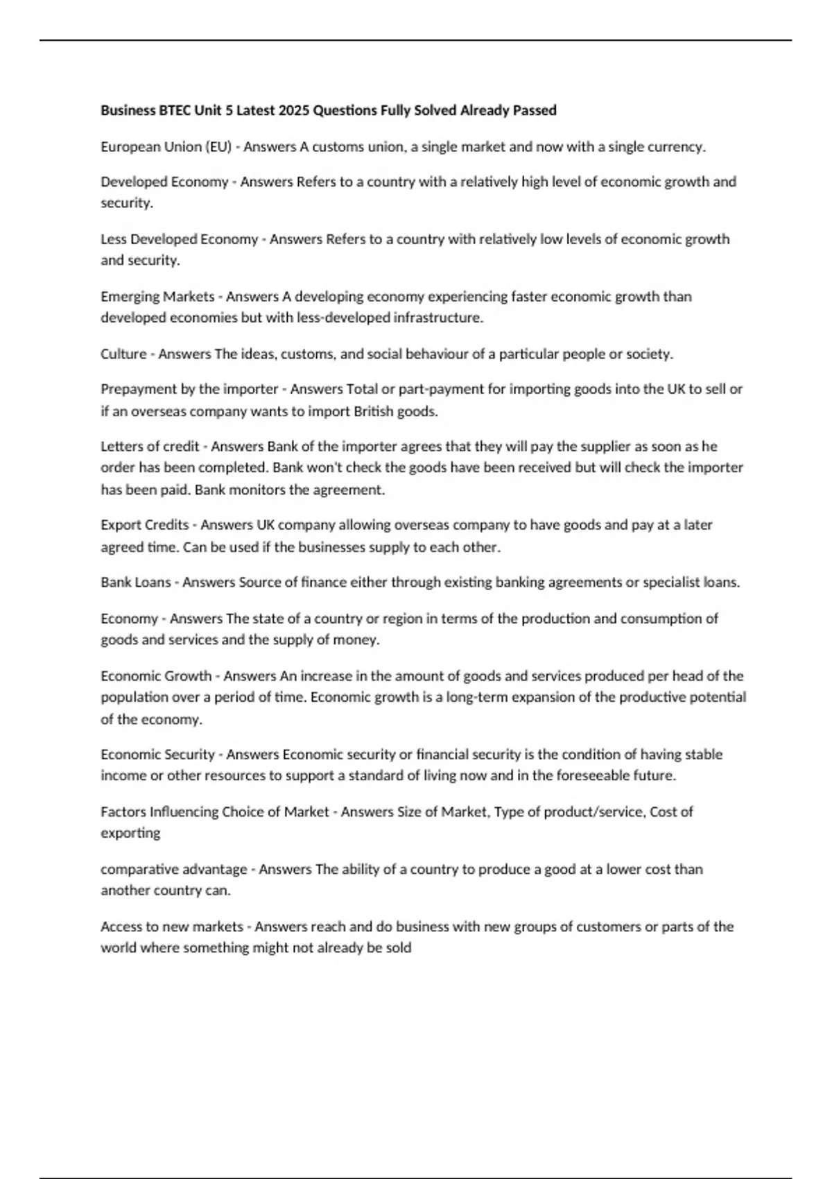 Business BTEC Unit 5 Latest 2025 Questions Fully Solved Already Passed European Union (EU) - Answers A customs union, a single market and now with a single currency. Developed Economy - Answers Refers to a country with a relatively high level of economic growth and security. Less Developed Economy - Answers Refers to a country with relatively low levels of economic growth and security. Emerging Markets - Answers A developing economy experiencing faster economic growth than developed economies but with less-developed infrastructure. Culture - Answers The ideas, customs, and social behaviour of a particular people or society. Prepayment by the importer - Answers Total or part-payment for importing goods into the UK to sell or if an overseas company wants to import British goods. Letters of credit - Answers Bank of the importer agrees that they will pay the supplier as soon as he order has been completed. Bank won't check the goods have been received but will check the importer has been paid. Bank monitors the agreement. Export Credits - Answers UK company allowing overseas company to have goods and pay at a later agreed time. Can be used if the businesses supply to each other. Bank Loans - Answers Source of finance either through existing banking agreements or specialist loans. Economy - Answers The state of a country or region in terms of the production and consumption of goods and services and the supply of money. Economic Growth - Answers An increase in the amount of goods and services produced per head of the population over a period of time. Economic growth is a long-term expansion of the productive potential of the economy. Economic Security - Answers Economic security or financial security is the condition of having stable income or other resources to support a standard of living now and in the foreseeable future. Factors Influencing Choice of Market - Answers Size of Market, Type of product/service, Cost of exporting comparative advantage - Answers The ability of a country to produce a good at a lower cost than another country can.