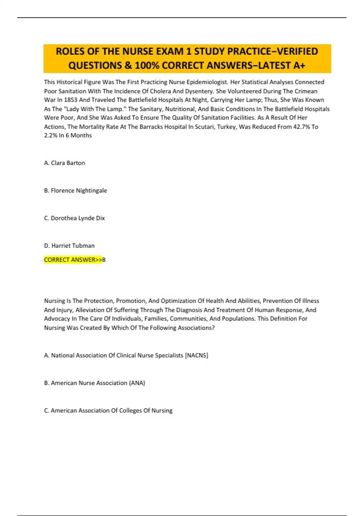 ROLES OF THE NURSE EXAM 1 STUDY PRACTICE−VERIFIED