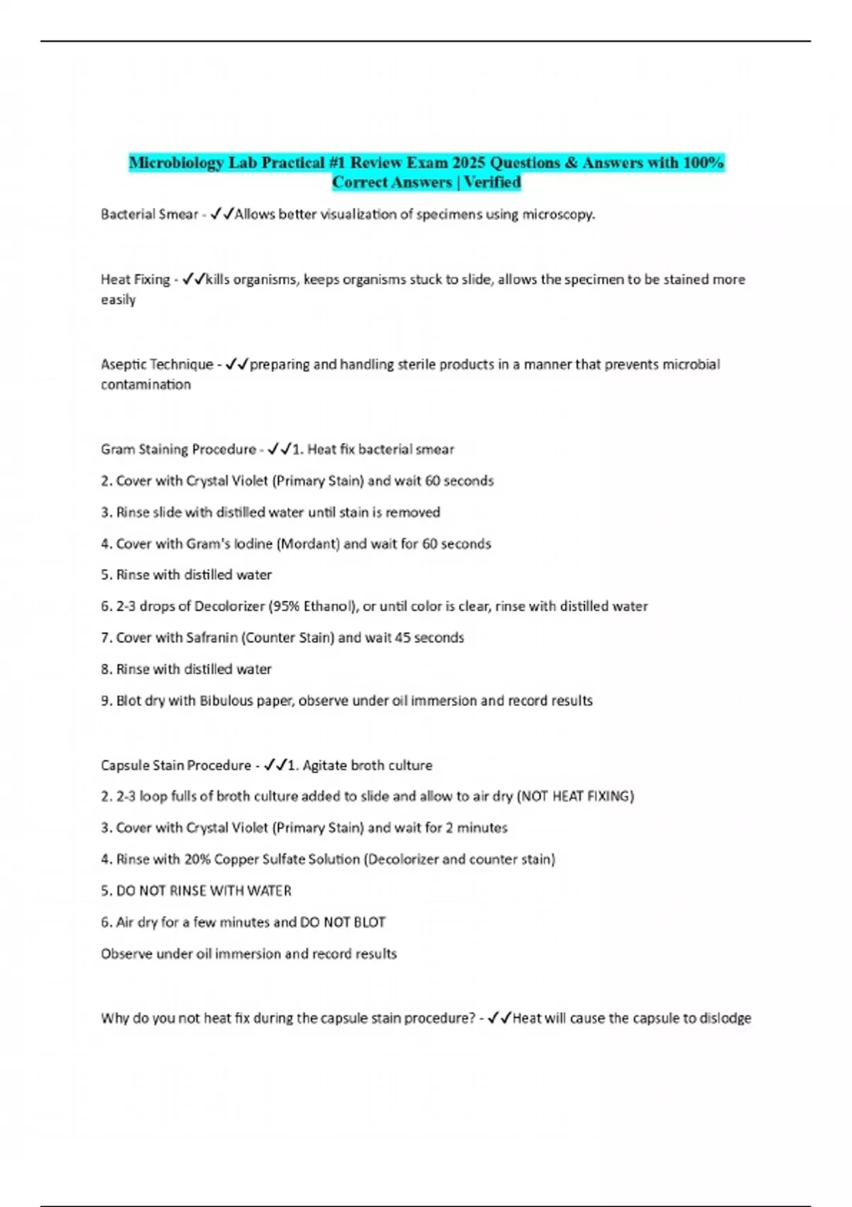 Bacterial Smear - Allows better visualization of specimens using microscopy. Heat Fixing - kills organisms, keeps organisms stuck to slide, allows the specimen to be stained more easily Aseptic Technique - preparing and handling sterile products in a manner that prevents microbial contamination Gram Staining Procedure - 1. Heat fix bacterial smear 2. Cover with Crystal Violet (Primary Stain) and wait 60 seconds 3. Rinse slide with distilled water until stain is removed 4. Cover with Gram's Iodine (Mordant) and wait for 60 seconds 5. Rinse with distilled water 6. 2-3 drops of Decolorizer (95% Ethanol), or until color is clear, rinse with distilled water 7. Cover with Safranin (Counter Stain) and wait 45 seconds 8. Rinse with distilled water 9. Blot dry with Bibulous paper, observe under oil immersion and record results Capsule Stain Procedure - 1. Agitate broth culture 2. 2-3 loop fulls of broth culture added to slide and allow to air dry (NOT HEAT FIXING) 3. Cover with Crystal Violet (Primary Stain) and wait for 2 minutes 4. Rinse with 20% Copper Sulfate Solution (Decolorizer and counter stain) 5. DO NOT RINSE WITH WATER 6. Air dry for a few minutes and DO NOT BLOT Observe under oil immersion and record results Why do you not heat fix during the capsule stain procedure? - Heat will cause the capsule to dislodge