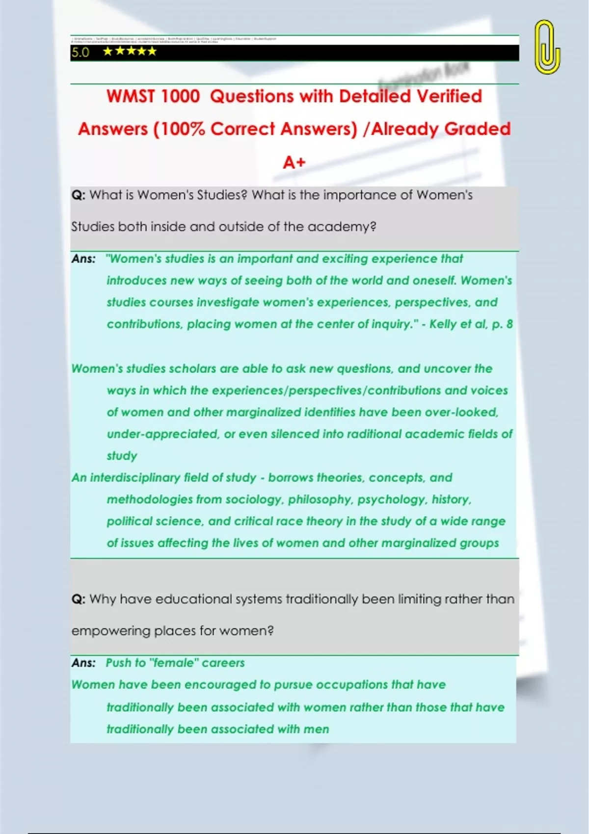 Q: What is Women's Studies? What is the importance of Women's Studies both inside and outside of the academy? Ans: "Women's studies is an important and exciting experience that introduces new ways of seeing both of the world and oneself. Women's studies courses investigate women's experiences, perspectives, and contributions, placing women at the center of inquiry." - Kelly et al, p. 8 Women's studies scholars are able to ask new questions, and uncover the ways in which the experiences/perspectives/contributions and voices of women and other marginalized identities have been over-looked, under-appreciated, or even silenced into raditional academic fields of study An interdisciplinary field of study - borrows theories, concepts, and methodologies from sociology, philosophy, psychology, history, political science, and critical race theory in the study of a wide range of issues affecting the lives of women and other marginalized groups Q: Why have educational systems traditionally been limiting rather than empowering places for women? Ans: Push to "female" careers Women have been encouraged to pursue occupations that have traditionally been associated with women rather than those that have traditionally been associated with men Examstudy - Stuvia US Women have not been encouraged to pursue careers in technology, engineering, math Expectations about where men and women's natural abilities lie Women usually encounter male professors in university/college Women often constructed as passive and emotional Teachers, parents, media, and others in positions of authority, reinforce stereotypes that women are by nature passive and emotional rather than inquisitive and assertive Men tend to occupy positions of authority Men tend to occupy higher-level administrative roles They have had the authority to define what counts as "valid areas of inquiry" and "legitimate methods for knowledge seeking" Because of the gender imbalance that we find when it comes to those who have the most power when it comes to structuring the education system, women, women's experiences, and work by those working in women's studies have not been adequately brought into the mainstream education system and curricula "The dominant message is that human experience equals male experience. Sometimes this message is overt, but it is sometimes so subtle and deeply embedded in the educational experience that we are not aware of it - Kelly et al, p. 9 Q: What does feminism mean today? What are some of the reasons that women do not want to be associated with feminism? Ans: "The term feminism refers to the belief that women have been historically subordinate to men as well as to the commitment to working for freedom for women in all aspects of social life." - Kelly, et al., p. 11 Feminism is not about having women dominate men. It's also not about hating men. Feminism is about equality. Examstudy - Stuvia US Women don't want to be associated with feminism because: Range of stereotypes and negative cultural representations associated with feminists Man hating Perpetuating the view that all men are evil Working to have women dominate men Most of the reasons people distance themselves from the term feminist are inconsistent with the definition and foals of feminism and the feminist movement Q: What are the key issues that characterized each of the three feminist movements? Ans: 1st Wave Feminism - Better education for women, political representation for women. 2nd Wave Feminism: Advancing social and legal status of women Further political representation Change in existing patriarchal laws (divorce, domestic violence, abortion) Sociocultural purposes: improve representation of women in media, advance women's status in workplace, question the assumption that women should prize marriage and raising children over their education and careers Q: Do you agree with conservative feminist writer Christina Hoff Sommers "that you can't ha