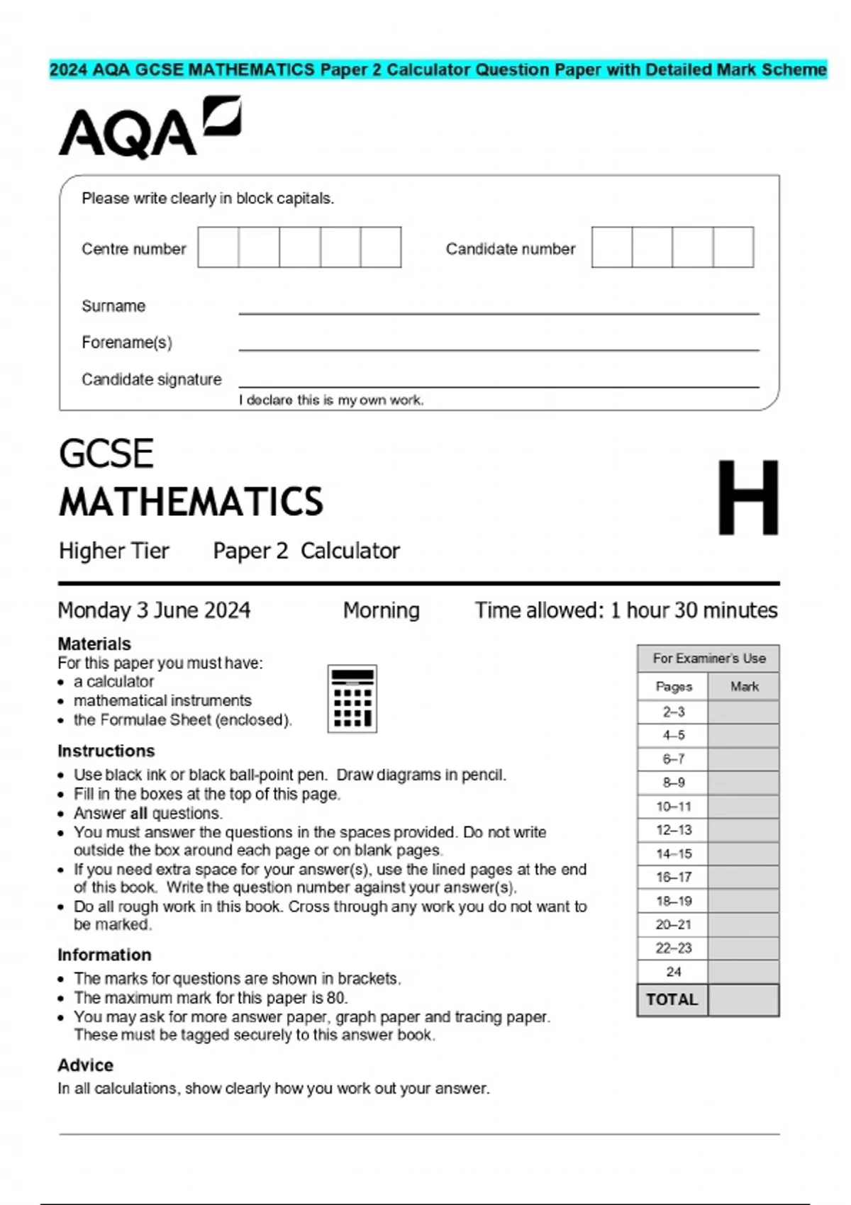 2024 AQA GCSE MATHEMATICS Question Paper with Detailed Mark Scheme