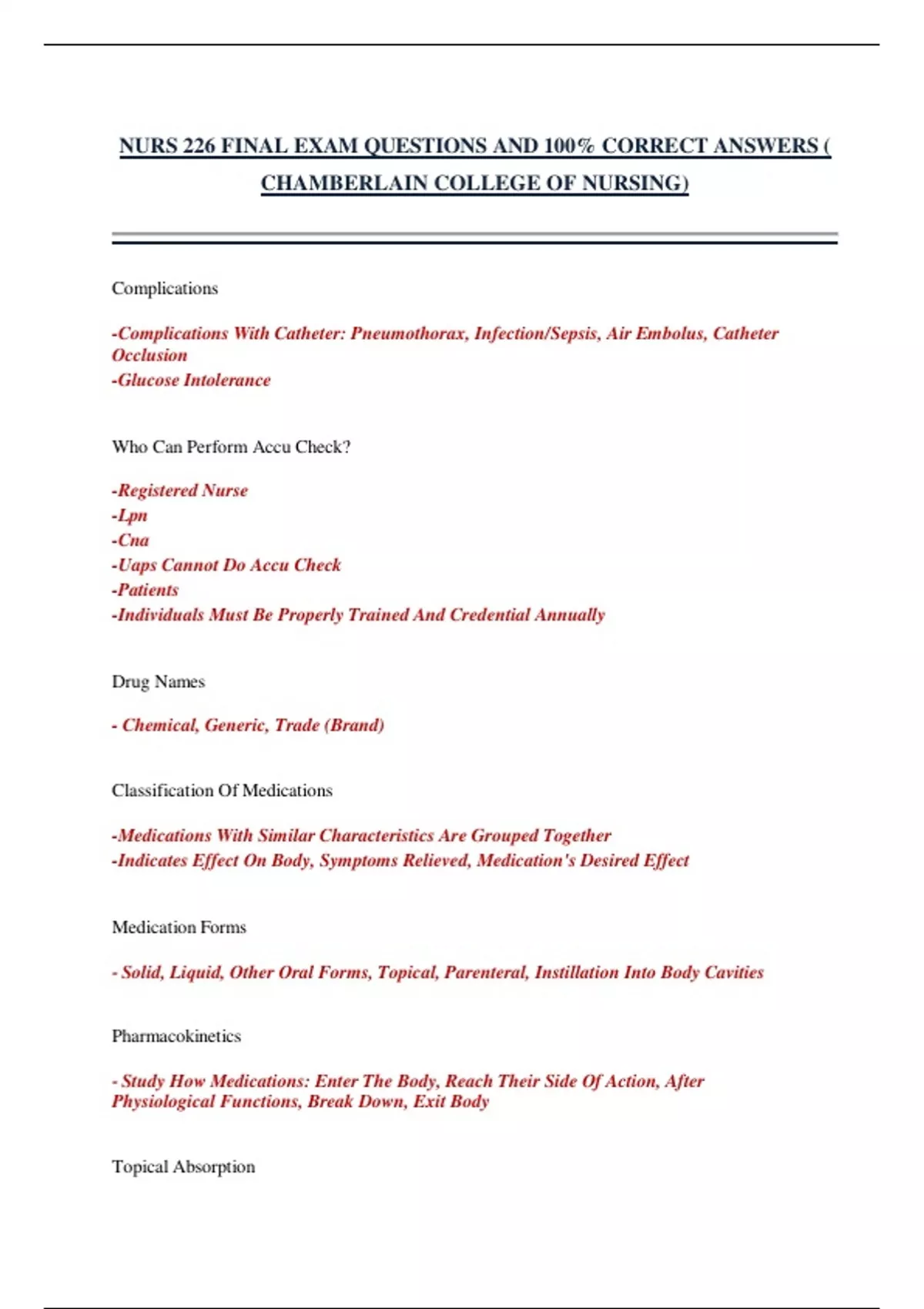NURS 226 FINAL EXAM QUESTIONS AND 100% CORRECT ANSWERS ( CHAMBERLAIN COLLEGE OF NURSING)