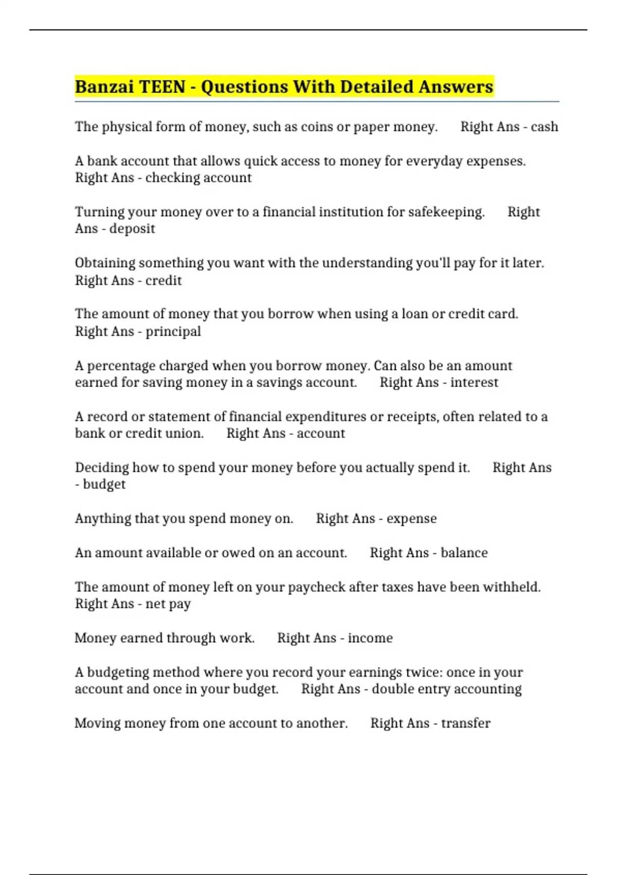 Money earned through work. Right Ans - income