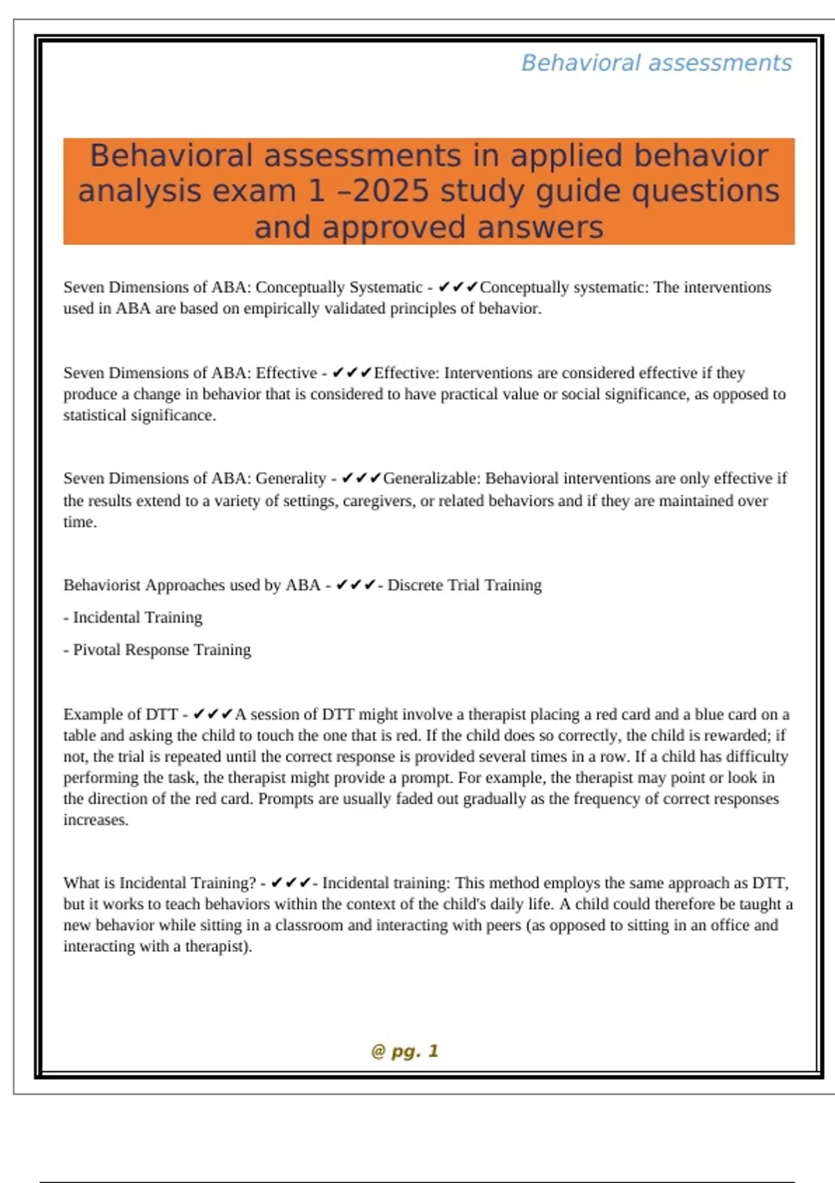 Seven Dimensions of ABA: Conceptually Systematic - Conceptually systematic: The interventions used in ABA are based on empirically validated principles of behavior. Seven Dimensions of ABA: Effective - Effective: Interventions are considered effective if they produce a change in behavior that is considered to have practical value or social significance, as opposed to statistical significance. Seven Dimensions of ABA: Generality - Generalizable: Behavioral interventions are only effective if the results extend to a variety of settings, caregivers, or related behaviors and if they are maintained over time. Behaviorist Approaches used by ABA - - Discrete Trial Training - Incidental Training - Pivotal Response Training Example of DTT - A session of DTT might involve a therapist placing a red card and a blue card on a table and asking the child to touch the one that is red. If the child does so correctly, the child is rewarded; if not, the trial is repeated until the correct response is provided several times in a row. If a child has difficulty performing the task, the therapist might provide a prompt. For example, the therapist may point or look in the direction of the red card. Prompts are usually faded out gradually as the frequency of correct responses increases. What is Incidental Training? - - Incidental training: This method employs the same approach as DTT, but it works to teach behaviors within the context of the child's daily life. A child could therefore be taught a new behavior while sitting in a classroom and interacting with peers (as opposed to sitting in an office and interacting with a therapist). Incidental Training Example - During a break, a girl might say to her teacher, "Want ball." The teacher could use this as an opportunity for incidental training by asking, "Do you want the red ball or the blue ball?" If the girl elaborates on her initial request by naming the color of the ball she wants, the teacher would reward her with that ball. This aspect of ABA may also be conducted by parents at home. For example, a mother coloring with her son might ask him to pass her the blue crayon. If he does, he would be rewarded, and if he does not, the mother might provide assistance in the form of a prompt. What is Pivotal Response Training? - Pivotal response training: This approach teaches children skills that affect a wide variety of behaviors. When a child masters a pivotal skill, parents typically notice improvement in several other areas. Pivotal Response Training Example - A child who learns to sit quietly, for example, may exhibit better behavior in school, get along with teachers more easily, and listen more attentively to directions. Pivotal response training therefore helps to generalize behaviors that have been learned or improved on in a therapy setting by applying them to everyday situations. Autism and ABA - - to increase behaviors (eg reinforcement procedures increase on-task behavior, or social interactions); History of ABA - - Evolved and uses concepts of behaviorism developed by John B. Watson and B.F Skinner. - The emergence of ABA as a distinct scientific field occurred in the late 1950s and 1960s. In 1968, Donald Baer, Montrose Wolf, and Todd Risley introduced seven dimensions of ABA in the inaugural issue of the Journal of Applied Behavior Analysis. Six key components of ABA - - guided by methods of scientific inquiry - All behavior change procedures are described and implemented systematically and technologically - Focus is socially significant behavior - make meaningful improvement in behavior - analyses factors responsible for improvement - Concepts are derived from the basic principles of behavior.