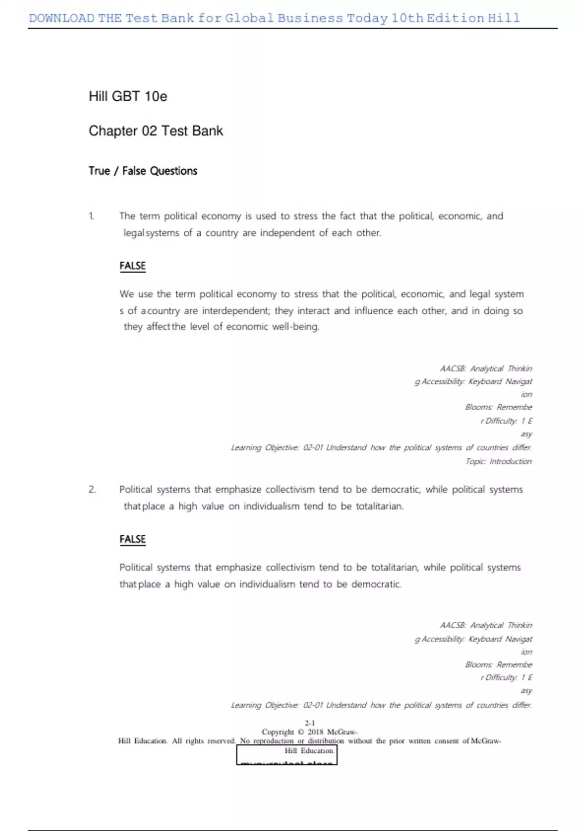, DOWNLOAD THE Test Bank for Global Business Today 10th Edition Hill