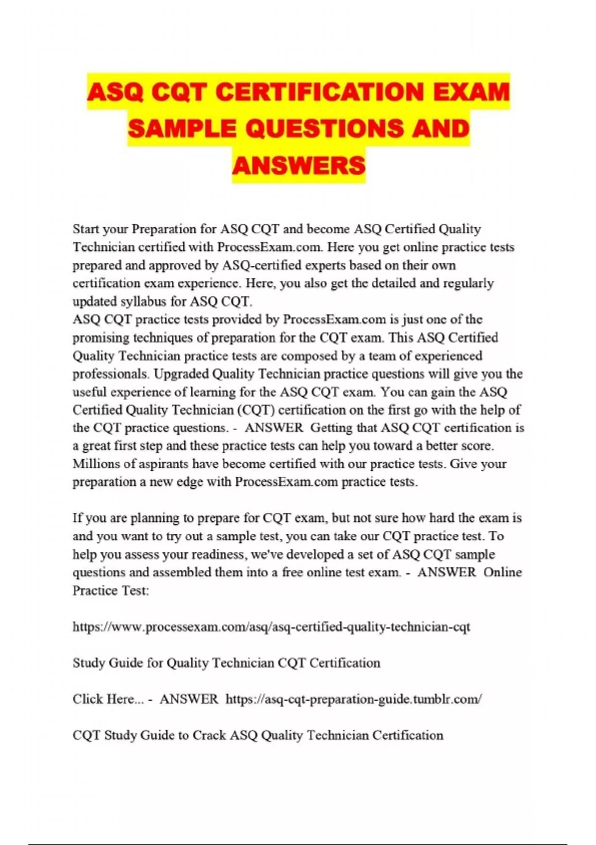 ASQ CQT CERTIFICATION EXAM SAMPLE QUESTIONS AND ANSWERS...