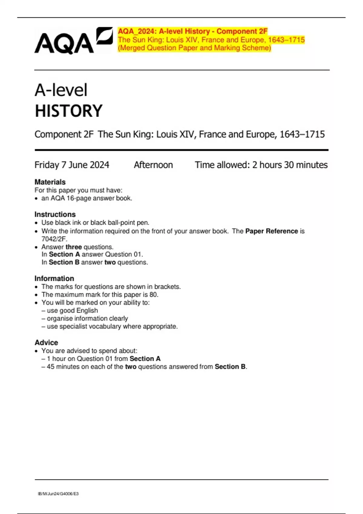 AQA_2024: A-level History - Component 2F The Sun King: Louis XIV, France and Europe, 1643–1715 (Merged Question Paper and Marking Scheme)