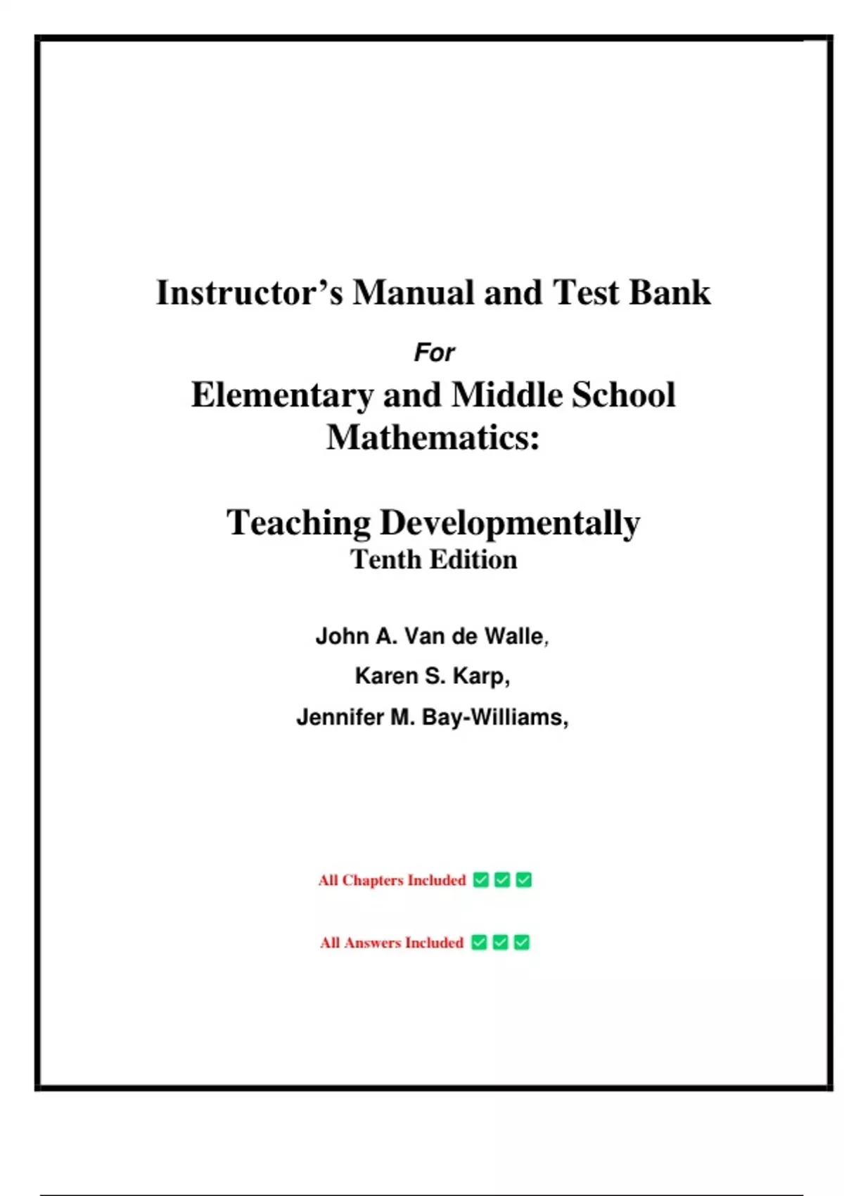 Instructor’s Manual and Test Bank for Elementary and Middle School Mathematics: Teaching Developmentally 10th Edition, by John Van de Walle, Chapter 1-22