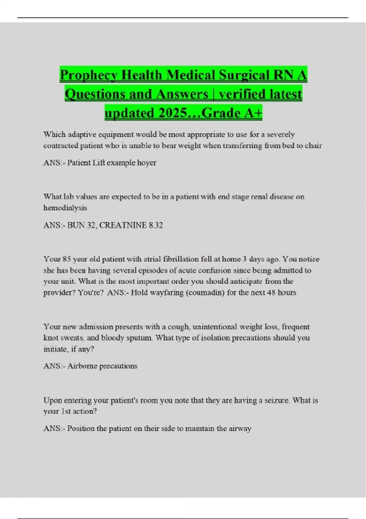 Prophecy Health Medical Surgical RN A Questions and Answers | verified latest updated 2025…Grade A+