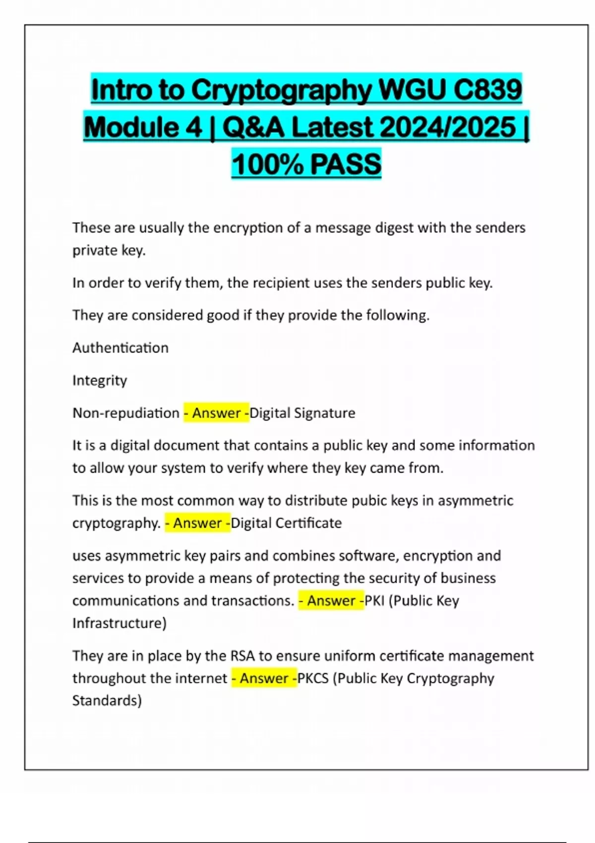 ntro to Cryptography WGU C839 Module 4 | Q&A Latest 2024/2025 | 100% PASS These are usually the encryption of a message digest with the senders private key. In order to verify them, the recipient uses the senders public key. They are considered good if they provide the following. Authentication Integrity Non-repudiation - Answer -Digital Signature It is a digital document that contains a public key and some information to allow your system to verify where they key came from. This is the most common way to distribute pubic keys in asymmetric cryptography. - Answer -Digital Certificate uses asymmetric key pairs and combines software, encryption and services to provide a means of protecting t