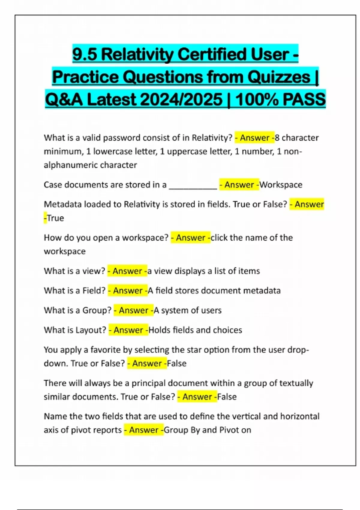 9.5 Relativity Certified User - Practice Questions from Quizzes | Q&A Latest 2024/2025 | 100% PASS