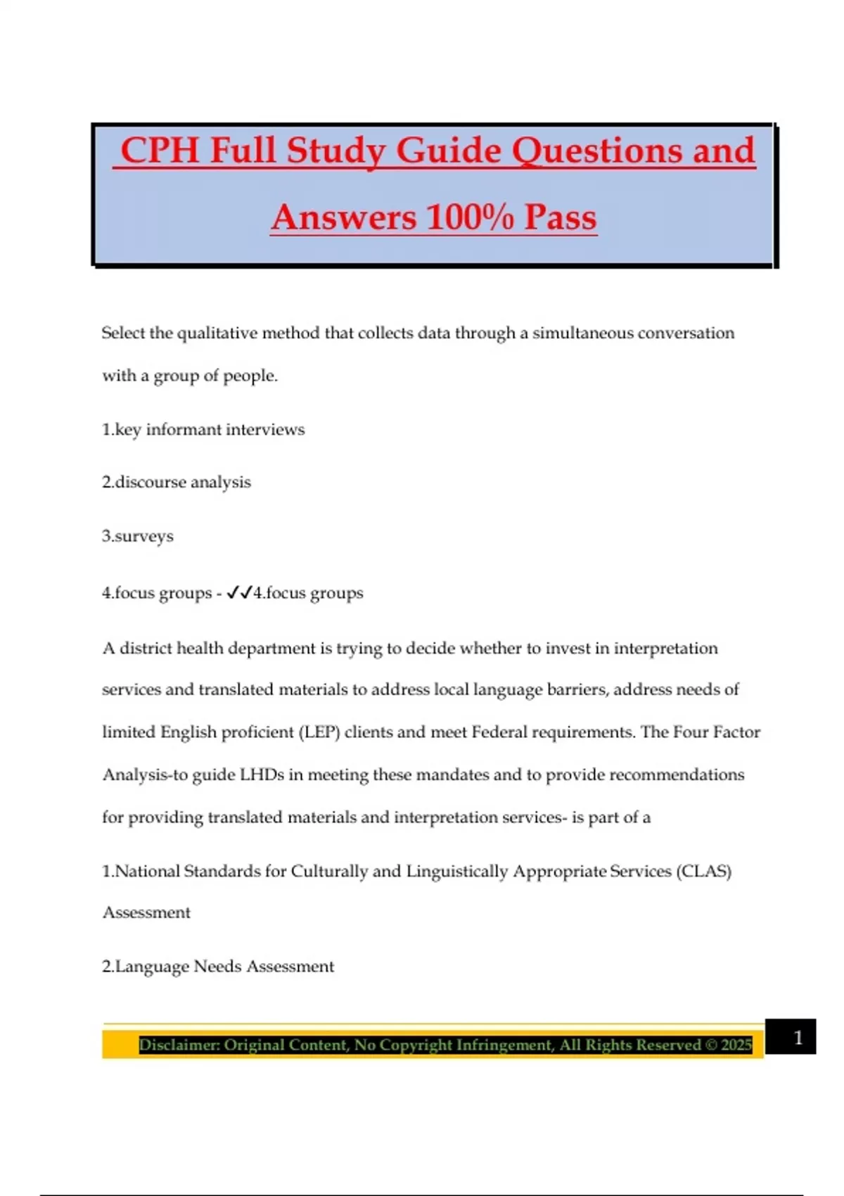 CPH Full Study Guide Questions and Answers 100% Pass Select the qualitative method that collects data through a simultaneous conversation with a group of people. informant interviews urse analysis ys groups - groups A district health department is trying to decide whether to invest in interpretation services and translated materials to address local language barriers, address needs of limited English proficient (LEP) clients and meet Federal requirements. The Four Factor Analysis-to guide LHDs in meeting these mandates and to provide recommendations for providing translated materials and interpretation services- is part of a 1.National Standards for Culturally and Linguistically Appropriate Services (CLAS) Assessment 2.Language Needs Assessment 2Disclaimer: Original Content, No Copyright Infringement, All Rights Reserved © 2025 3.Health Resource Access Assessment 4.Community Literacy Assessment - 2.Language Needs Assessment Waiting until a program or intervention is complete to begin evaluation activities misses important and valuable opportunities for what type of evaluation? 1.Outcome and impact evaluation 2.Summative evaluation 3.Process evaluation 4.Participant evaluation - 3.Process evaluation Total coliform and E. coli counts are performed in routine monitoring of drinking water reservoirs because: 1.These bacteria commonly cause gastrointestinal infection in humans. 2.They are a more easily grown indicator of Legionella spp. contamination. 3.Outdated laws require heterotrophic plate count monitoring of water. 4.Their numbers give general indication of a water supply's sanitary condition. - 4.Their numbers give general indication of a water supply's sanitary condition. The logic model that has been the dominant paradigm representing types of information that may be collected to draw inferences about quality of care provided by a healthcare system has been: 3Disclaimer: Original Content, No Copyright Infringement, All Rights Reserved © 2025 1.Donabedian's model 2.Shewart's PDCA 3.Theory of Change 4.Web of Causation - 1.Donabedian's model The difference between primary and secondary prevention of disease is: 1.Primary prevention focuses on control of causal factors, while secondary prevention focuses on control of symptoms 2.Primary prevention focuses on control of acute disease, while secondary prevention focuses on control of chronic disease 3.Primary prevention focuses on control of causal factors, while secondary prevention focuses on early detection and treatment of disease 4.Primary prevention focuses on increasing resistance to disease, while secondary prevention focuses on decreasing exposure to disease - 3.Primary prevention focuses on control of causal factors, while secondary preventi